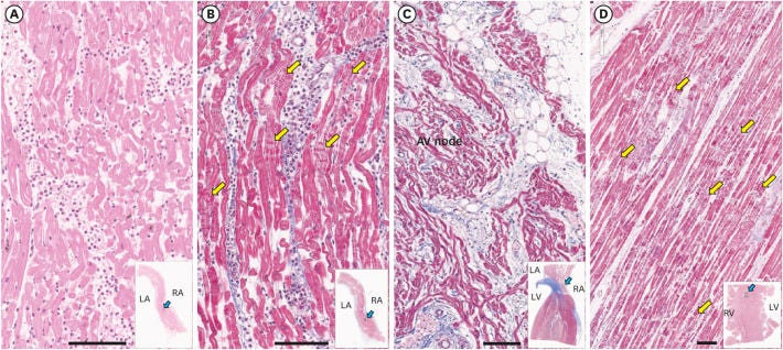 Histopathology of the heart. (A) Hematoxylin and eosin stains of atrial septum shows massive inflammatory infiltration with neutrophil predominance. (B) The myocytes often show contraction band necrosis (yellow arrows), which were highlighted by Masson's trichrome staining. (C) The atrioventricular node area shows extension of atrial myocarditis to the superficial layer of the node. (D) The ventricular myocardium is free of inflammatory infiltrates, but there are multiple large foci of contraction band necrosis (yellow arrows) particularly in the left ventricular wall and the ventricular septum. Bars represent 100 µm. The blue arrows in insets show where the section was taken from the low magnification views. Hematoxylin and eosin stain was used for the specimen shown in (A) and Masson's trichrome stain was used for the specimen shown in (B-D).