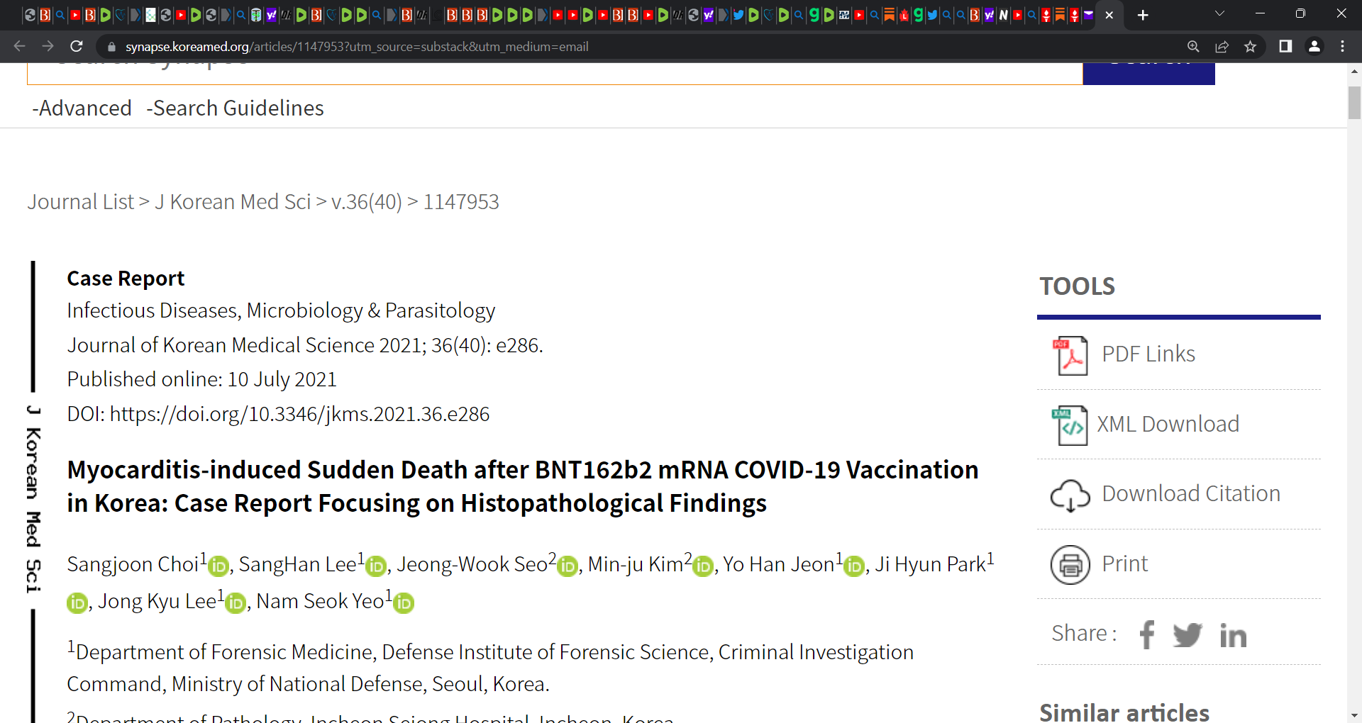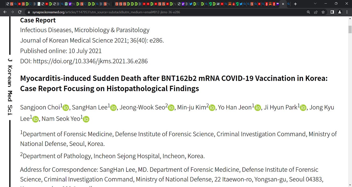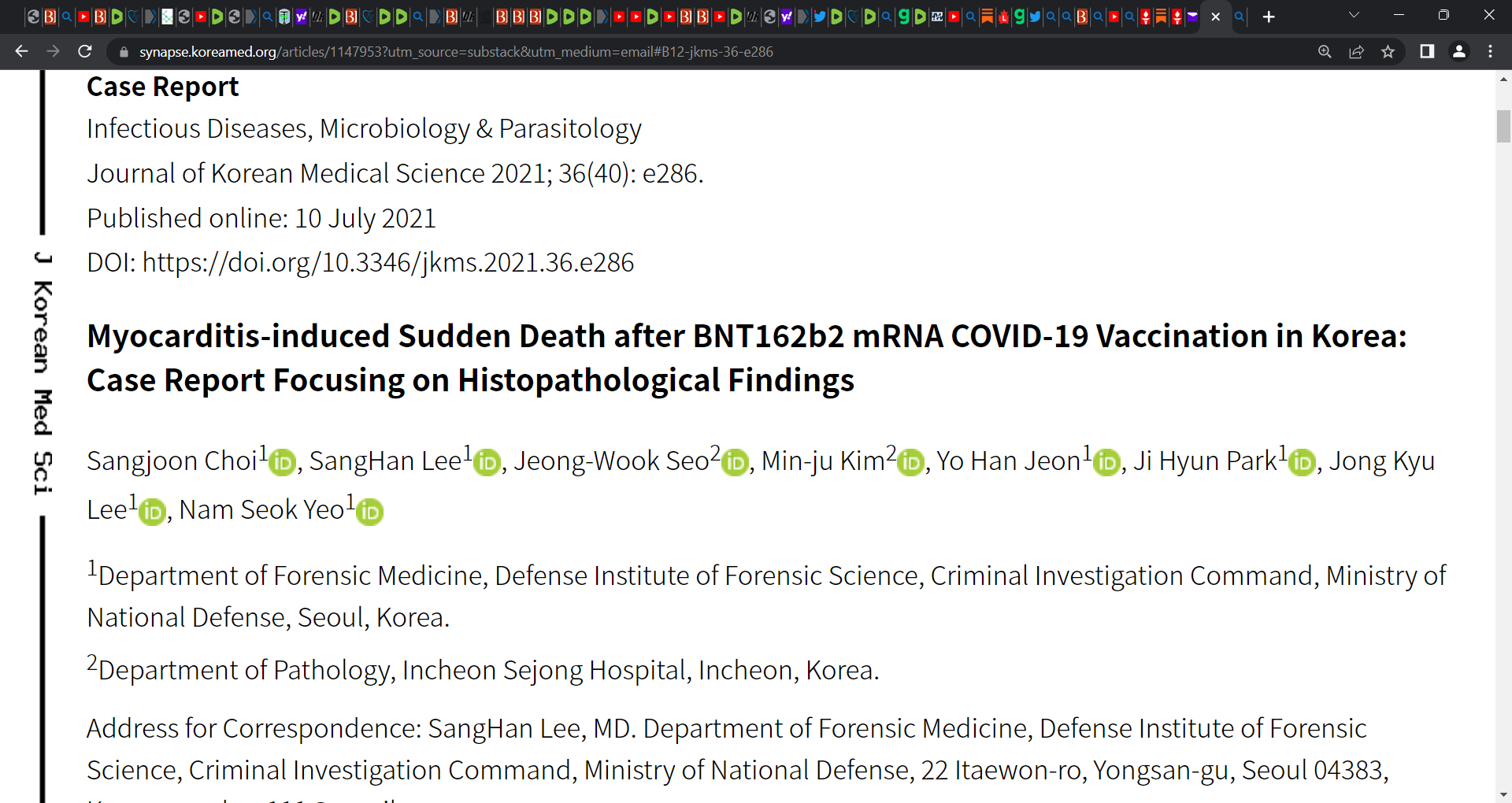 ‘The deceased was 22-year-old male military recruit. His blood pressure was elevated on physical examination 17 and 7 months before his death (156/94 mmHg and 128/74 mmHg, respectively), but he was otherwise healthy. On June 13, 2021, 5 days after the first dose of BNT162b2 mRNA vaccination, he complained to a colleague of chest pain at 1:00 AM, during a smoke break, and went to bed. At 8:00 AM, he was found unconscious hunched beside the bed. He was taken to an emergency department and was found to have ventricular fibrillation on electrocardiography. Cardiopulmonary resuscitation was performed for two hours, but he could not be resuscitated.