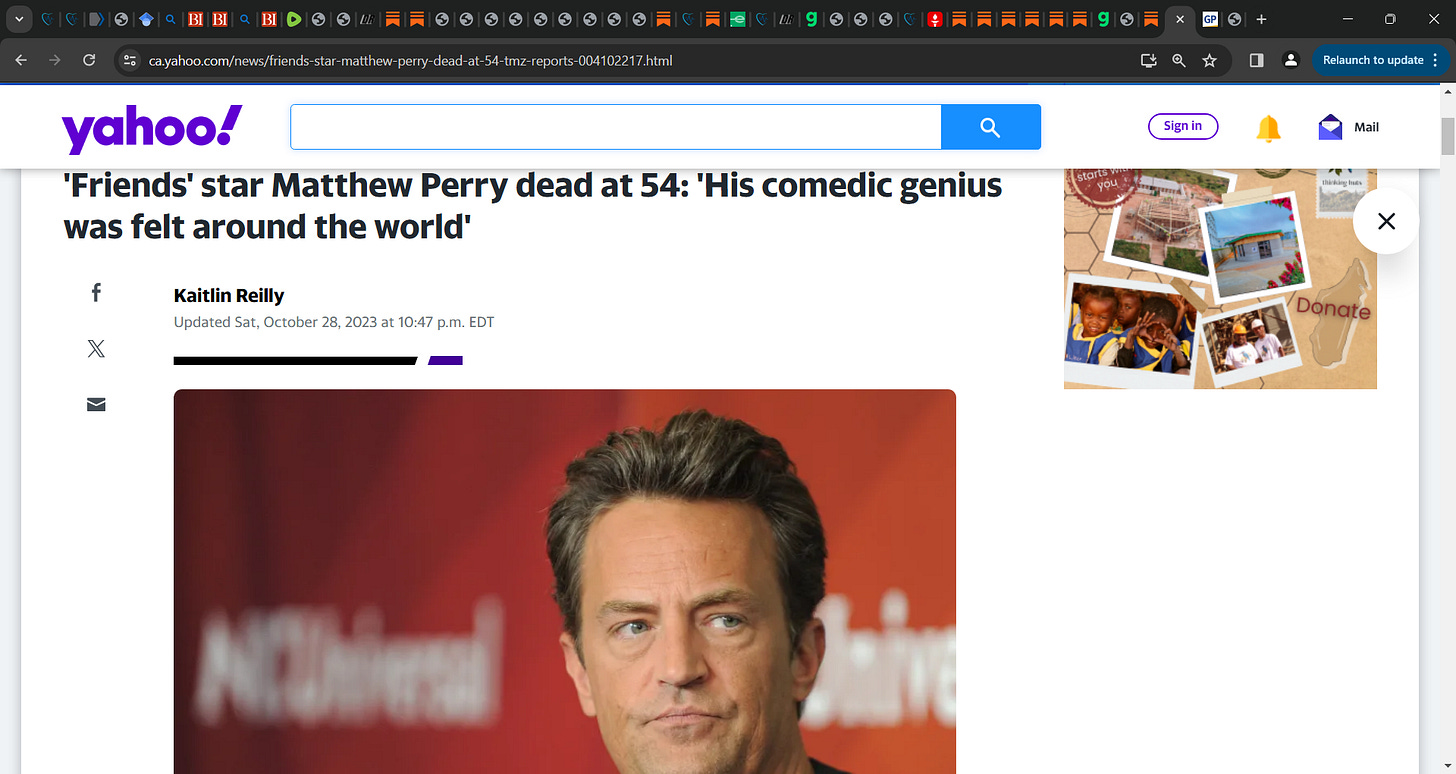 Mathew Perry, sad death, yes, found him in his tub, very sad, condolescences to family, BUT did he die, did he suffer a cardiac arrest, DUE to the COVID mRNA technology gene vaccine (Pfizer, Moderna,