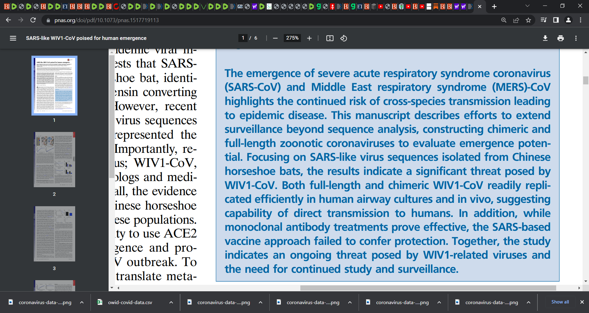 “Focusing on SARS-like virus sequences isolated from Chinese horseshoe bats, the results indicate a significant threat posed by WIV1-CoV. Both full-length and chimeric WIV1-CoV readily replicated efficiently in human airway cultures and in vivo, suggesting capability of direct transmission to humans. In addition, while monoclonal antibody treatments prove effective, the SARS-based vaccine approach failed to confer protection.”