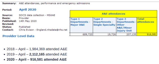 A&E attendance was 57% down in April 2020 compared to the previous year.