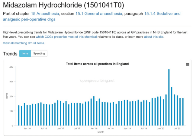 However, in April 2020 45,033 prescriptions for Midazolam were issued, containing 333,229 items, the vast majority being Midazolam Hydrochloride.