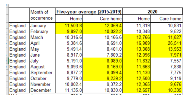 ‘Data taken from the Office for National Statistics (ONS) shows us that during April 2020 there were 26,541 deaths in care homes, an increase of 17,850 on the five-year average. This is half the amount of alleged Covid-19 deaths during the same period.