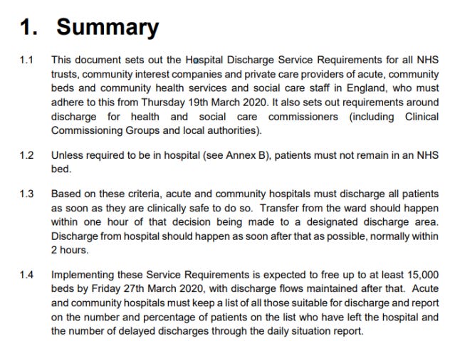 This directive meant that people who required medical treatment and attention were discharged into Care homes in the thousands.
