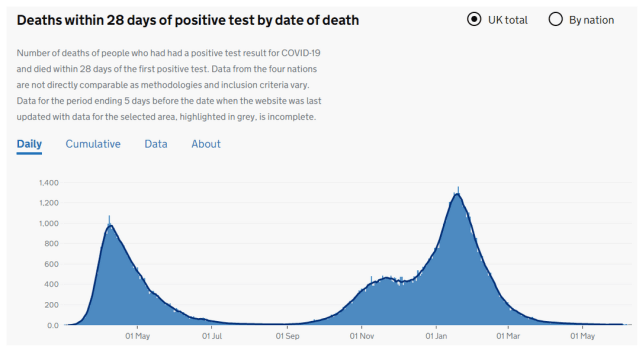 The following is a graph displayed on the UK Government website displaying deaths within 28 days of a positive test result for Covid-19 by date of death –
