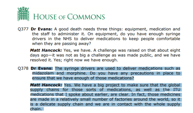 The following exchange took place in a parliamentary committee meeting on the 17th of April 2020 between Matt Hancock and Dr Evans, a Conservative MP.
