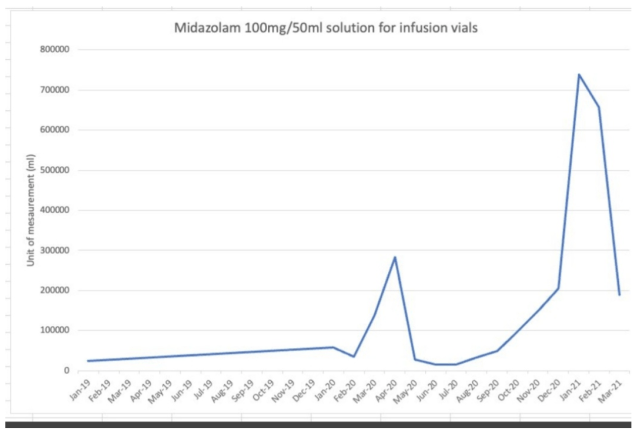 April 2020 – a huge surge in out-of-hospital Midazolam prescriptions out-of-hospital and a huge surge in production of Midazolam solution.