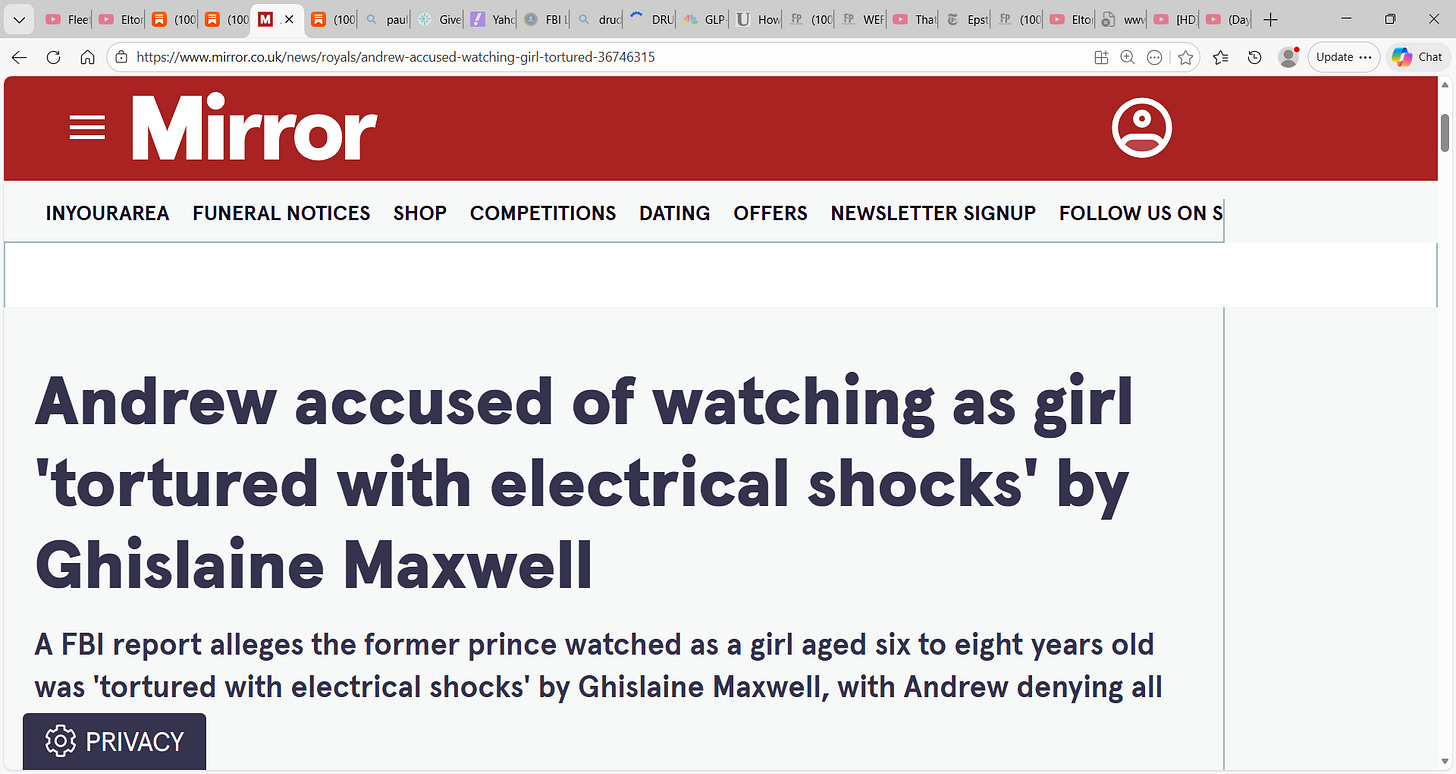 Now we learning that Andrew accused of watching as girl ‘tortured with electrical shocks’ by Ghislaine Maxwell…other males witnessed the torture and did nothing and we need to now who these fuckers are!