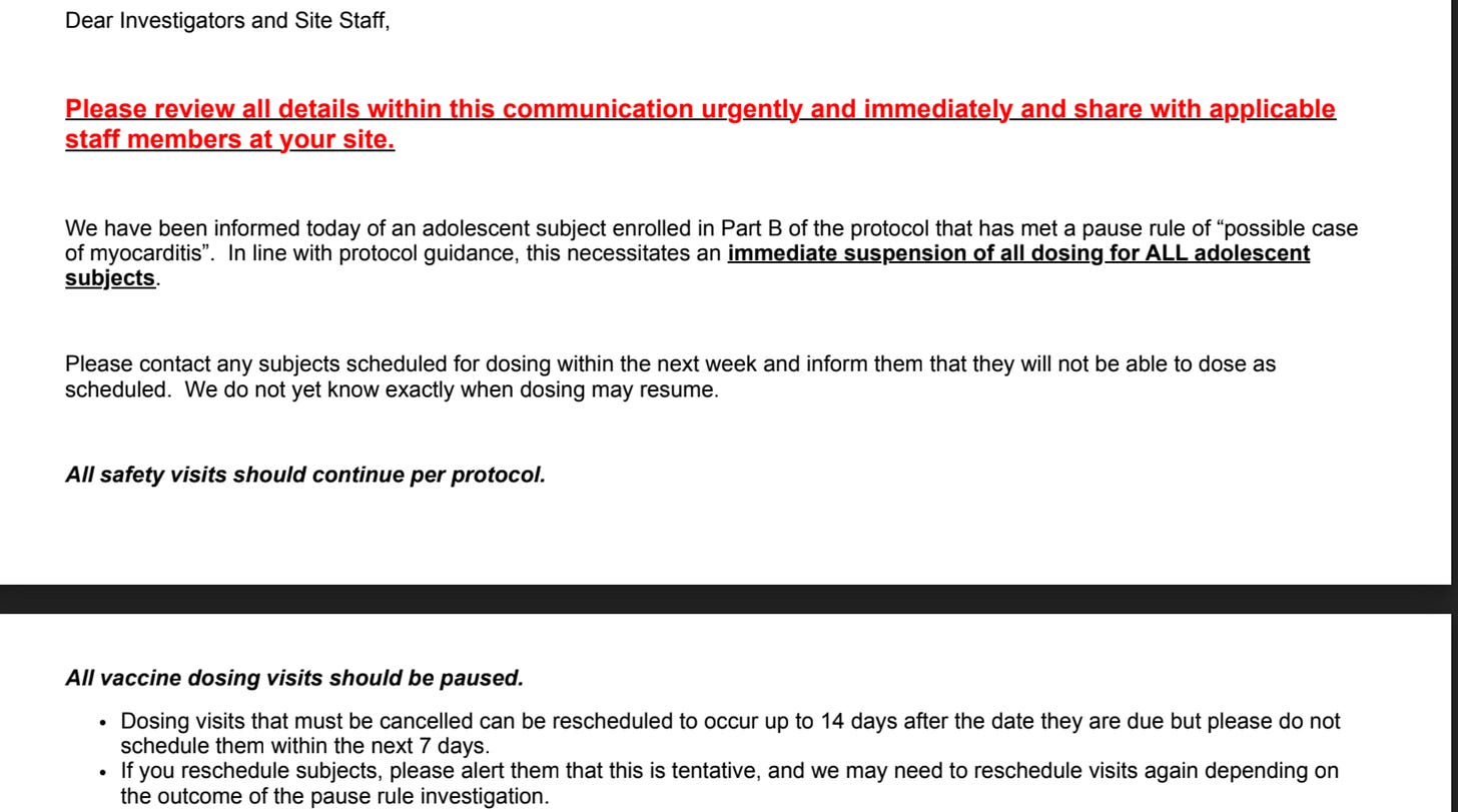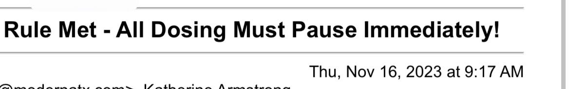 (All Dosing Must Pause Immediately! A partial subject line from the email sent halting the trial. Note the email time stamp - before Moderna stock opened for trading Thursday.)