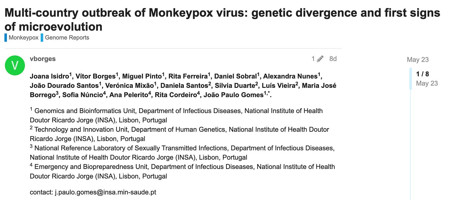 Multiple cases were soon detected in Portugal, and to their great credit, INSA Portugal got busy and promptly did the deep sequencing necessary to enable building a phylogenic map of the Monkeypox variant associated with the outbreak.