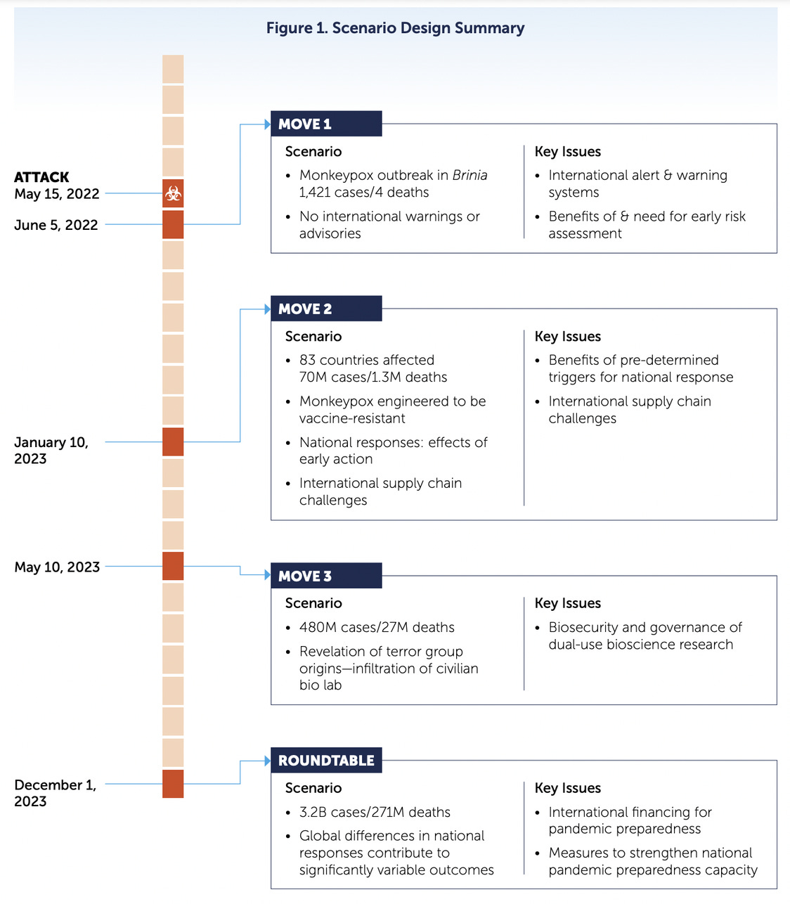 I almost cannot believe that I am writing this, but since my original substack article on this topic, we had the reveal of an Event 201-style wargame exercise modeled around a bioterror-related release of an engineered Monkeypox virus “caused by a terrorist attack using a pathogen engineered in a laboratory with inadequate biosafety and biosecurity provisions and weak oversight.” With amazing (coincidental?) prescience, the “table top exercise” of March 2021 (three months into the Covidcrisis) models a Monkeypox bioterror attack initiated on May 15, 2022. Note the date of the CNN/Jake Tapper fearporn piece - May 20, 2022. The modeling deployed in the scenario upon which the “exercise” was based predicts 3.2 billion cases and 271 million deaths by December 01, 2023. Of course, the predictive accuracy of the simplistic public health models such as that used to support this scenario have repeatedly proven to be absolutely horrid, and these types of models should be either relegated to the trash heap (or ongoing dumpster fire) as unscientific speculation which is all too frequently weaponized by the fearporn peddlers such as CNN, MSNBC, NYT, Washington Post. By now we all know the usual USG and WEF-controlled media players.