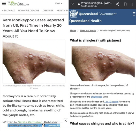 If Ronald Reagan were still with us, I suspect we would be hearing “There you go again” replays. First came the coordinated media blast of public health-related fearporn. For example, the image from Jake Tapper’s CNN broadcast program “The Lead” of May 20,2022 (above) which appears to me to be a case of smallpox, not monkeypox. Another example involves the self-explanatory paired images below.