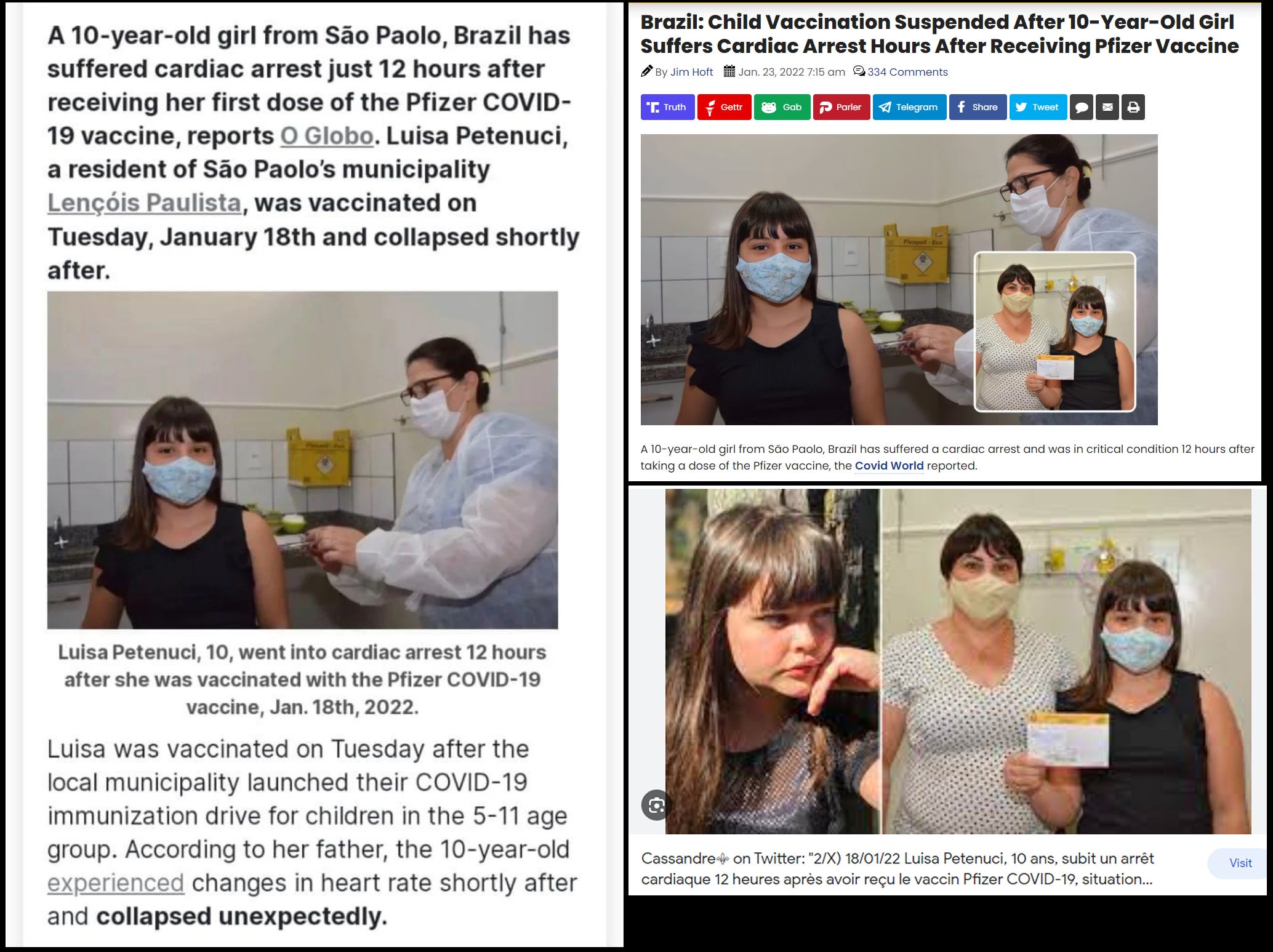 Sao Paolo, Brazil - 10 year old Luisa Petenuci suffered cardiac arrest 12 hours after her 1st Pfizer COVID-19 mRNA vaccine on Jan.18, 2022 (click here)