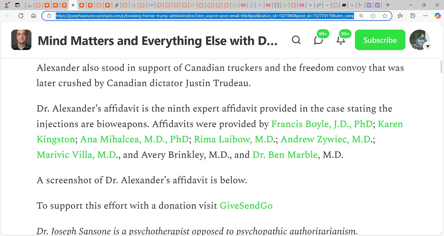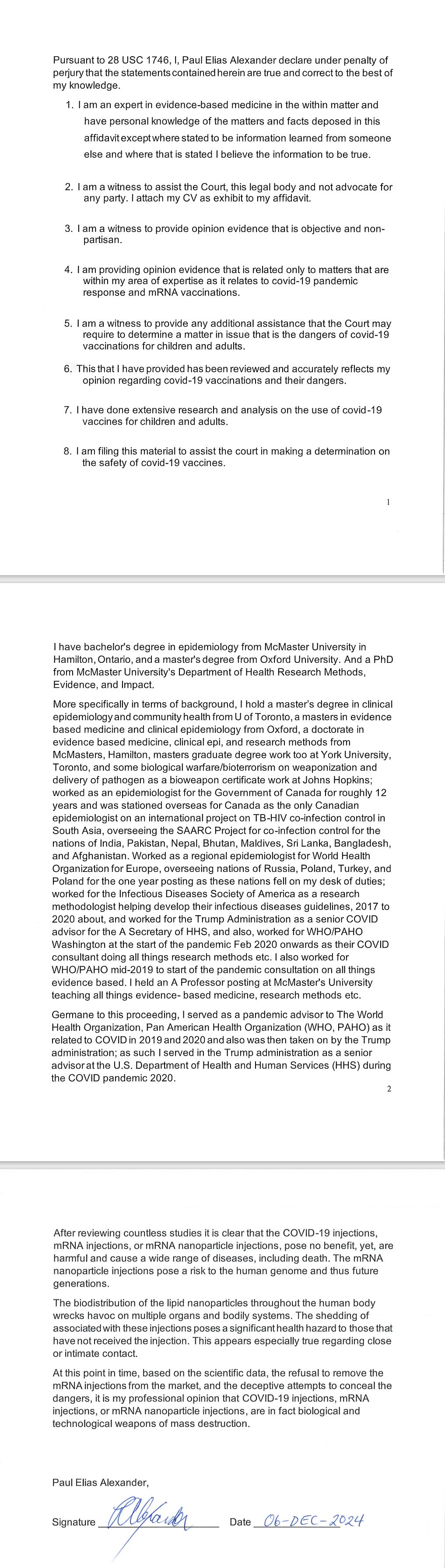 Dr. Alexander’s affidavit is the ninth expert affidavit provided in the case stating the injections are bioweapons. Affidavits were provided by Francis Boyle, J.D., PhD; Karen Kingston; Ana Mihalcea, M.D., PhD; Rima Laibow, M.D.; Andrew Zywiec, M.D.; Marivic Villa, M.D., and Avery Brinkley, M.D., and Dr. Ben Marble, M.D.