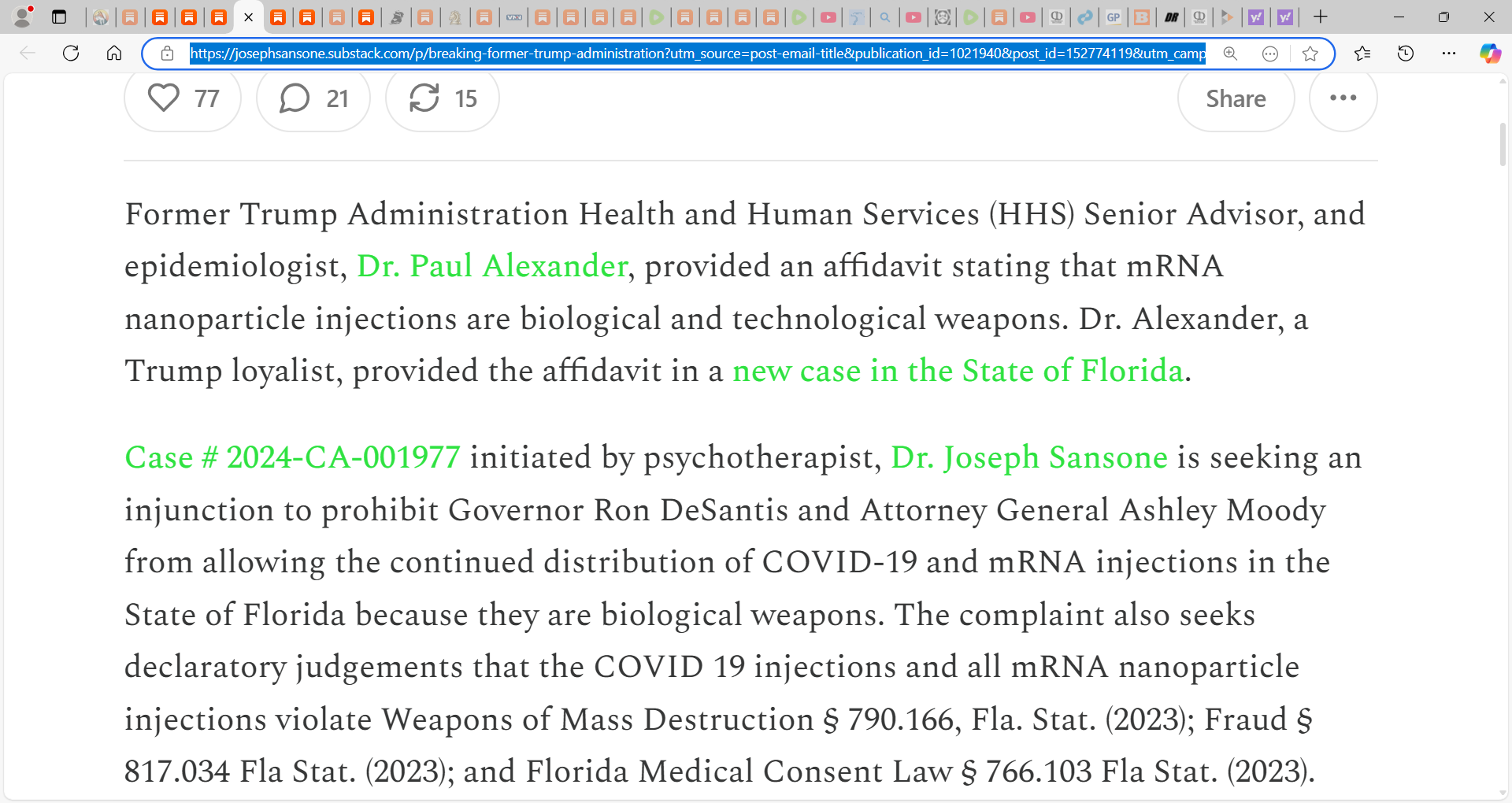 ‘Former Trump Administration Health and Human Services (HHS) Senior Advisor, and epidemiologist, Dr. Paul Alexander, provided an affidavit stating that mRNA nanoparticle injections are biological and technological weapons. Dr. Alexander, a Trump loyalist, provided the affidavit in a new case in the State of Florida.
