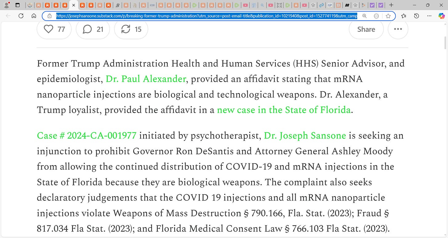 Case # 2024-CA-001977 initiated by psychotherapist, Dr. Joseph Sansone is seeking an injunction to prohibit Governor Ron DeSantis and Attorney General Ashley Moody from allowing the continued distribution of COVID-19 and mRNA injections in the State of Florida because they are biological weapons. The complaint also seeks declaratory judgements that the COVID 19 injections and all mRNA nanoparticle injections violate Weapons of Mass Destruction § 790.166, Fla. Stat. (2023); Fraud § 817.034 Fla Stat. (2023); and Florida Medical Consent Law § 766.103 Fla Stat. (2023).