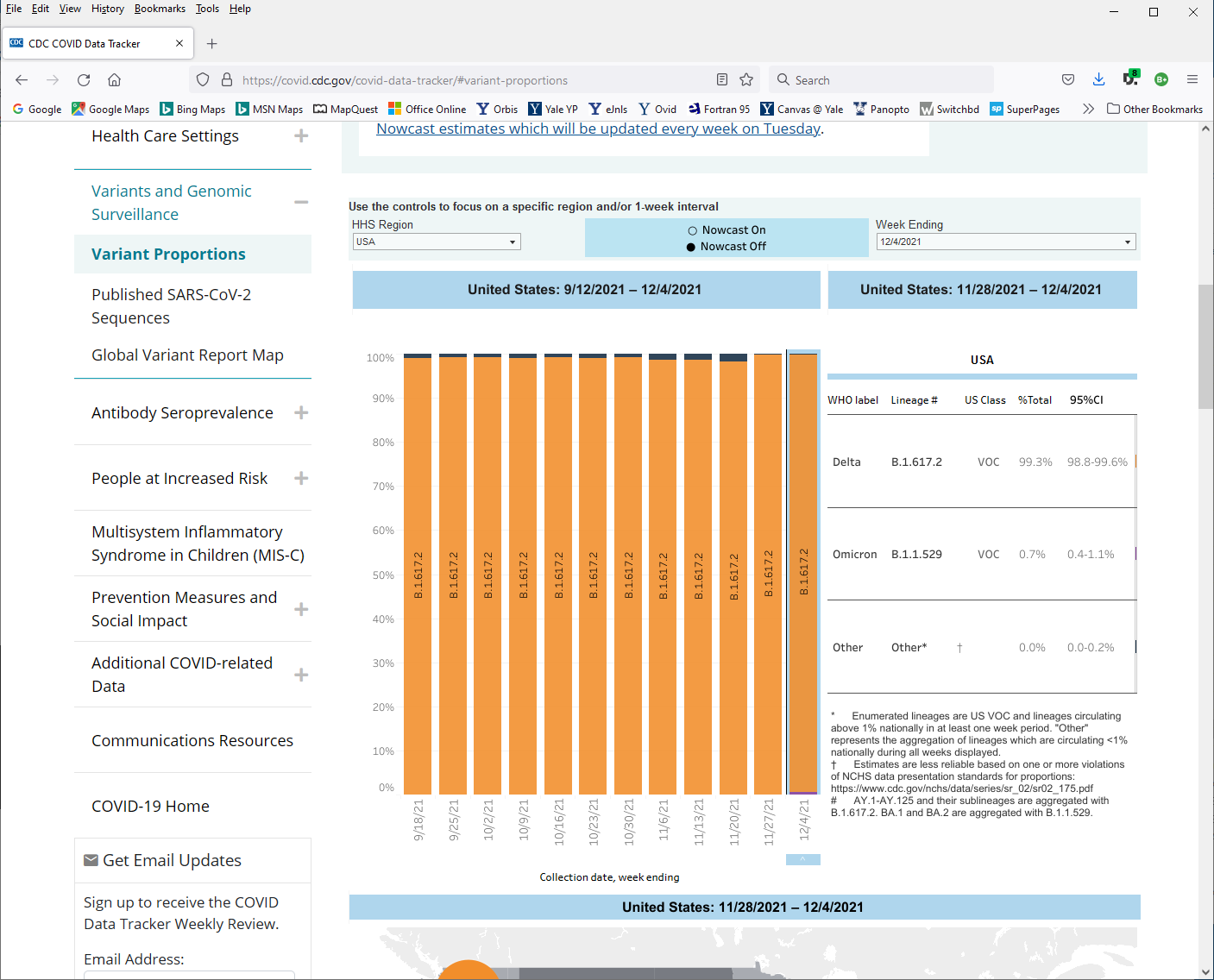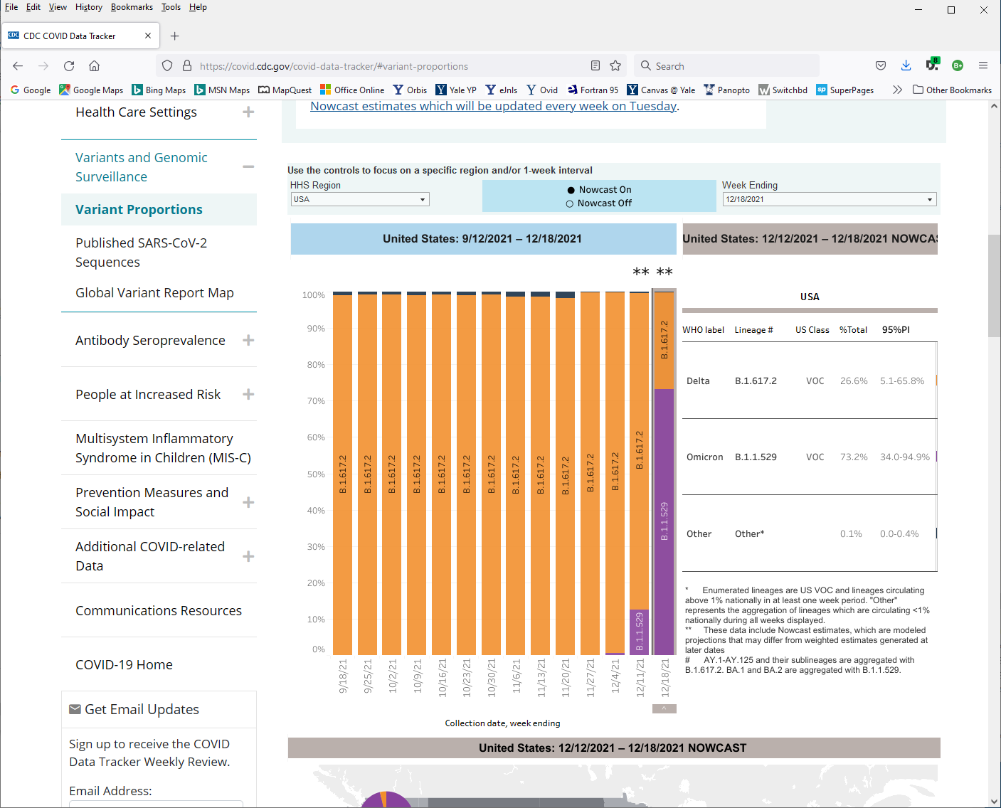 then they dropped this recent update and it boggles the mind where that purple came from…but this is a model projection and we could be easily fooled to think this is the current state of omicron now 75% dominant and displacing Delta…not so and if you accidently clicked the ‘Nowcast on’, then click it off to get back the third screen shot below which will show still, as of Dec 21 when I update this, that omicron is <1% in circulation…Delta is still 99% dominant and our concern, NOT Omicron: