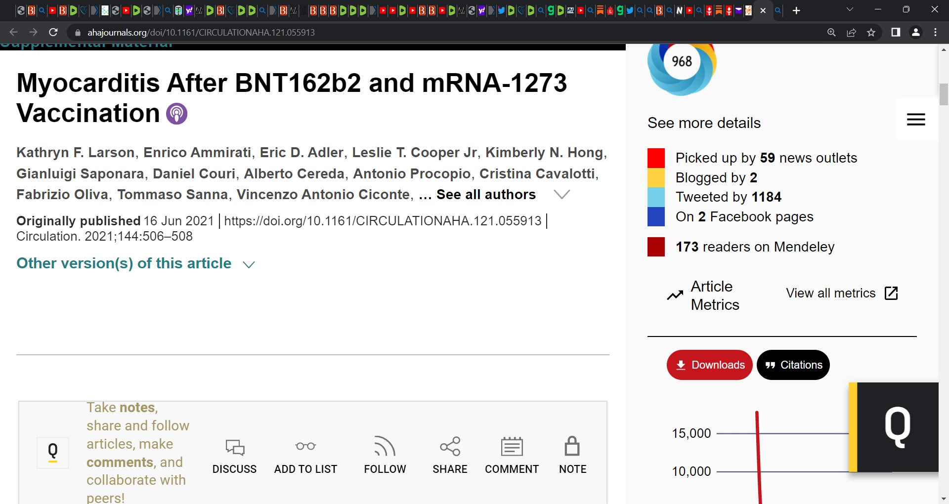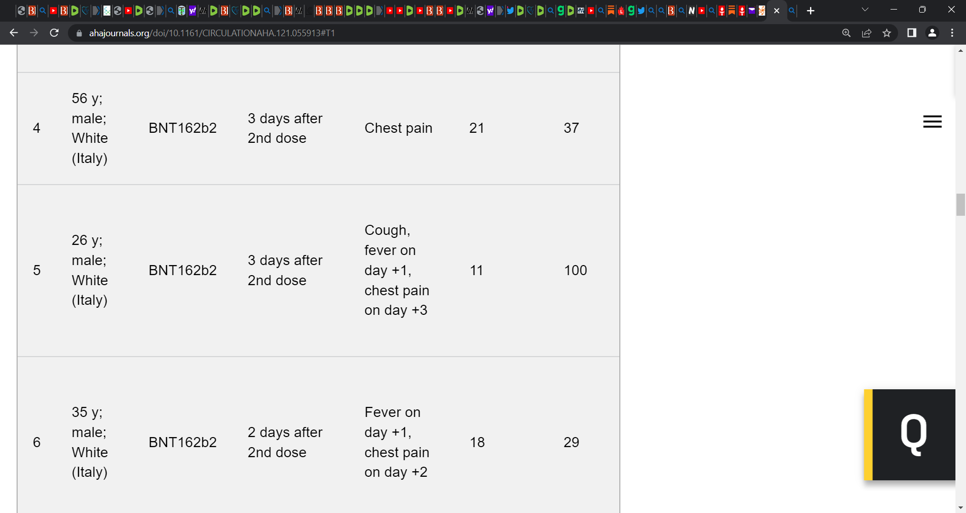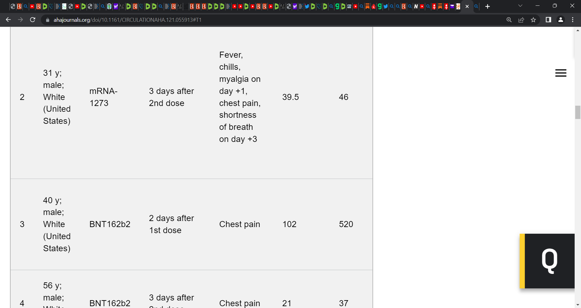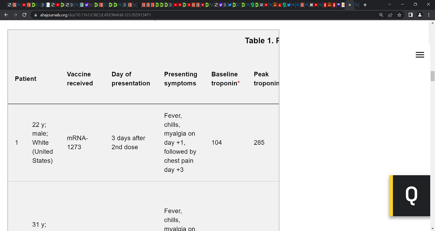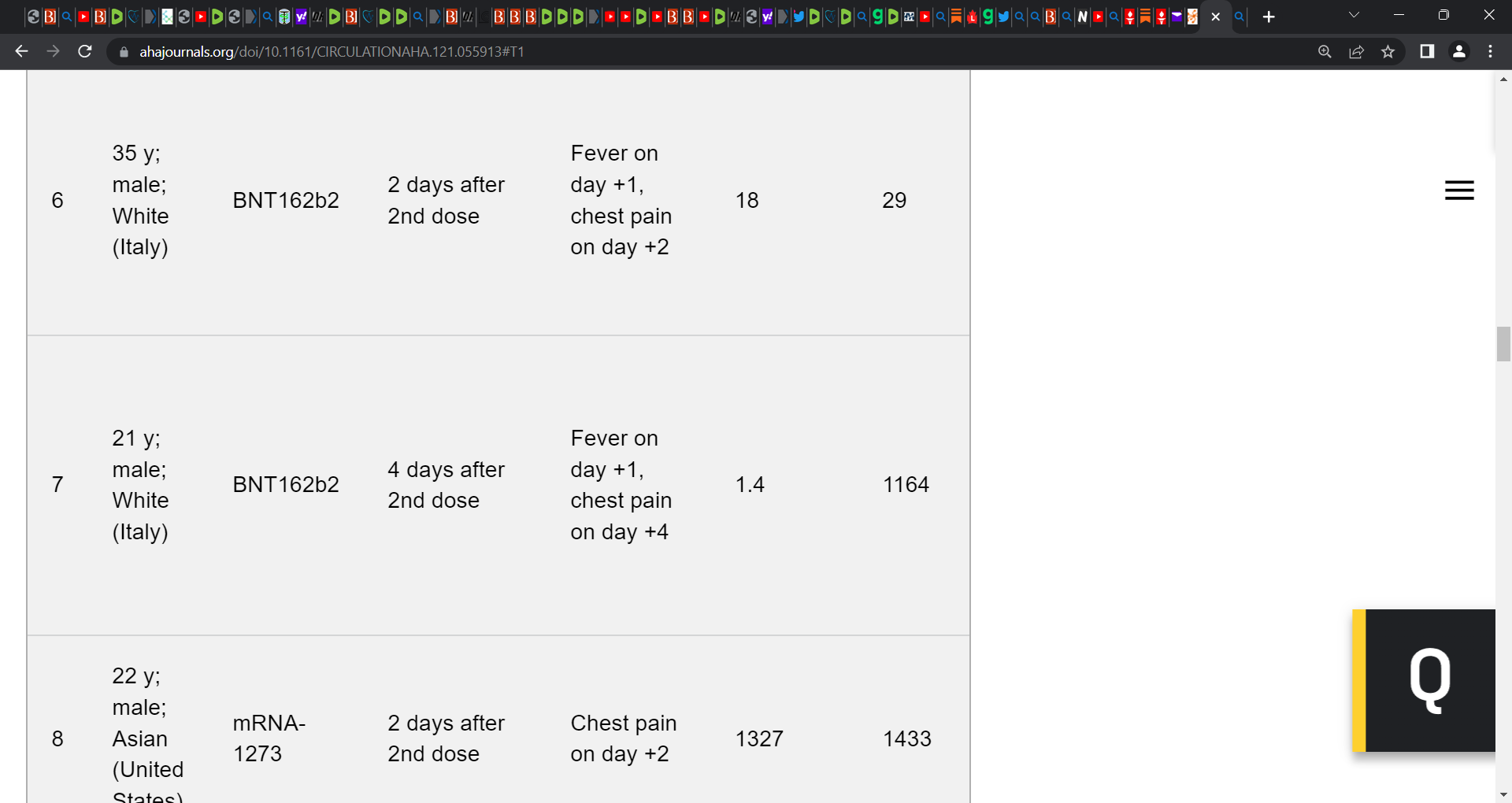 Myocarditis after Pfizer and Moderna mRNA technology based gene injection vaccine (Larson et al.); describes 8 patients who were hospitalized with chest pain and who were diagnosed with myocarditis