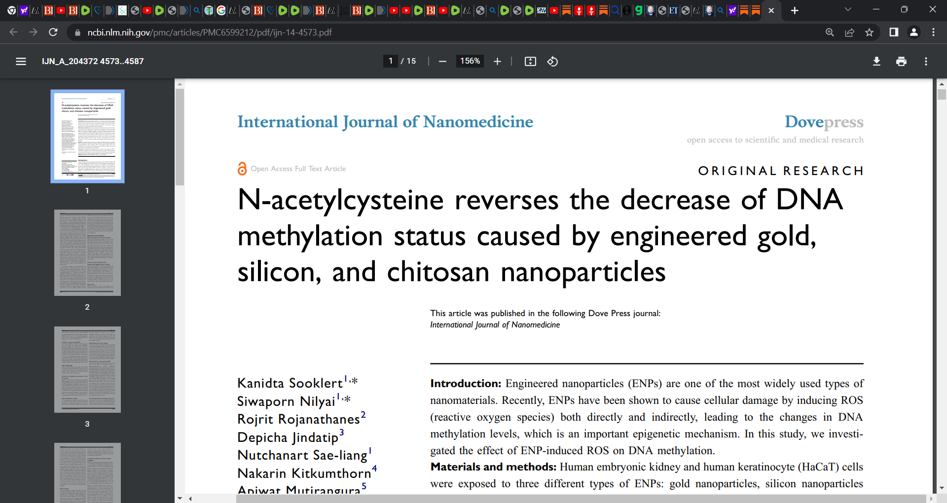 ‘Introduction: Engineered nanoparticles (ENPs) are one of the most widely used types of nanomaterials. Recently, ENPs have been shown to cause cellular damage by inducing ROS (reactive oxygen species) both directly and indirectly, leading to the changes in DNA methylation levels, which is an important epigenetic mechanism. In this study, we investigated the effect of ENP-induced ROS on DNA methylation.