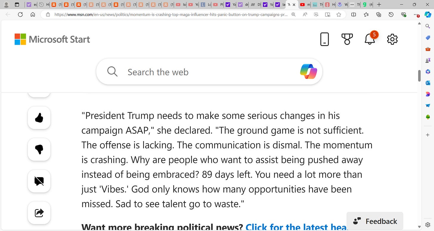 "President Trump needs to make some serious changes in his campaign ASAP," she declared. "The ground game is not sufficient. The offense is lacking. The communication is dismal. The momentum is crashing. Why are people who want to assist being pushed away instead of being embraced? 89 days left. You need a lot more than just 'Vibes.' God only knows how many opportunities have been missed. Sad to see talent go to waste."‘