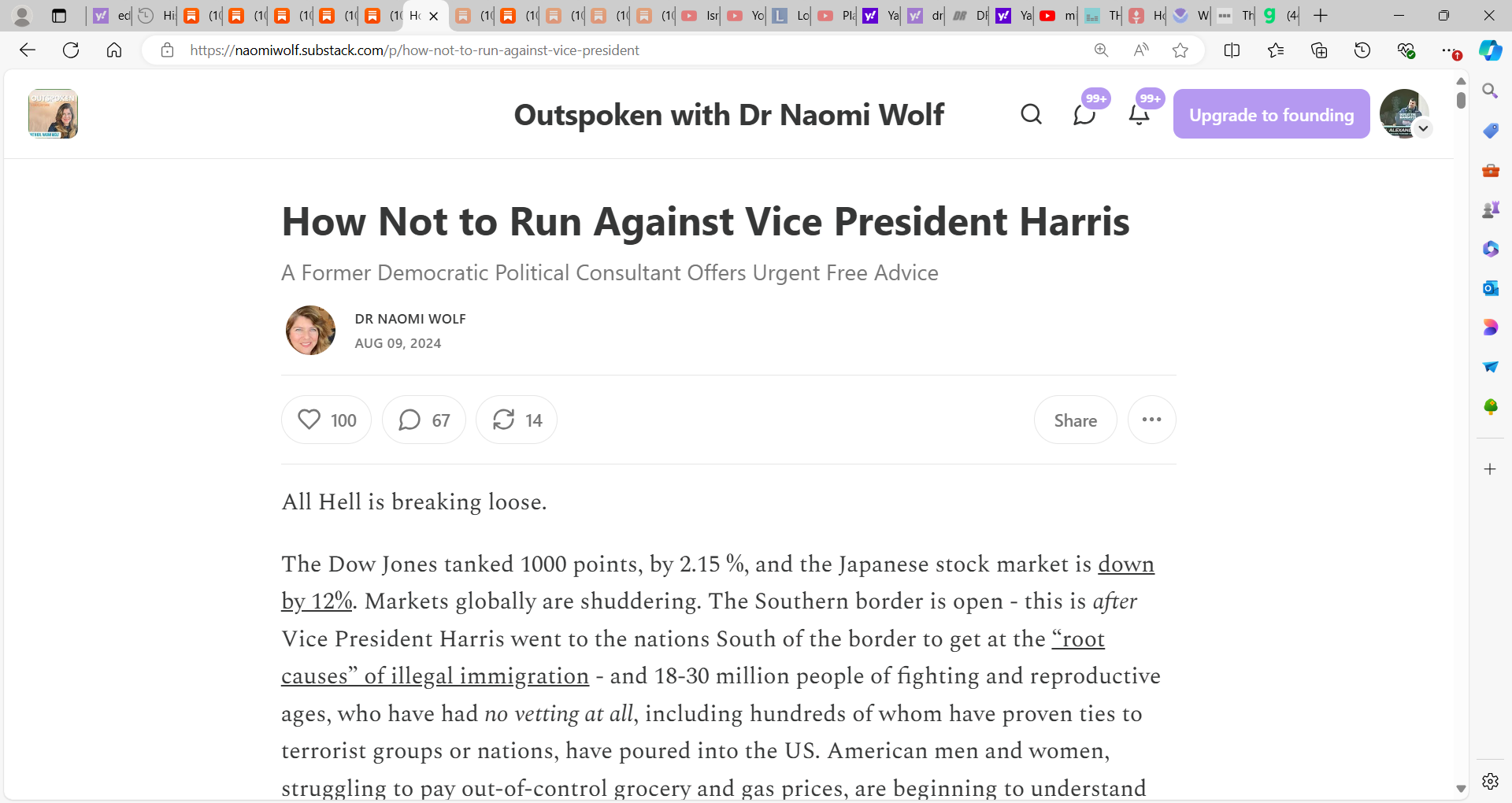 The Dow Jones tanked 1000 points, by 2.15 %, and the Japanese stock market is down by 12%. Markets globally are shuddering. The Southern border is open - this is after Vice President Harris went to the nations South of the border to get at the “root causes” of illegal immigration - and 18-30 million people of fighting and reproductive ages, who have had no vetting at all, including hundreds of whom have proven ties to terrorist groups or nations, have poured into the US. American men and women, struggling to pay out-of-control grocery and gas prices, are beginning to understand that these “newcomers” receive free luxury housing, free transportation, free food, and in some cases, room service.