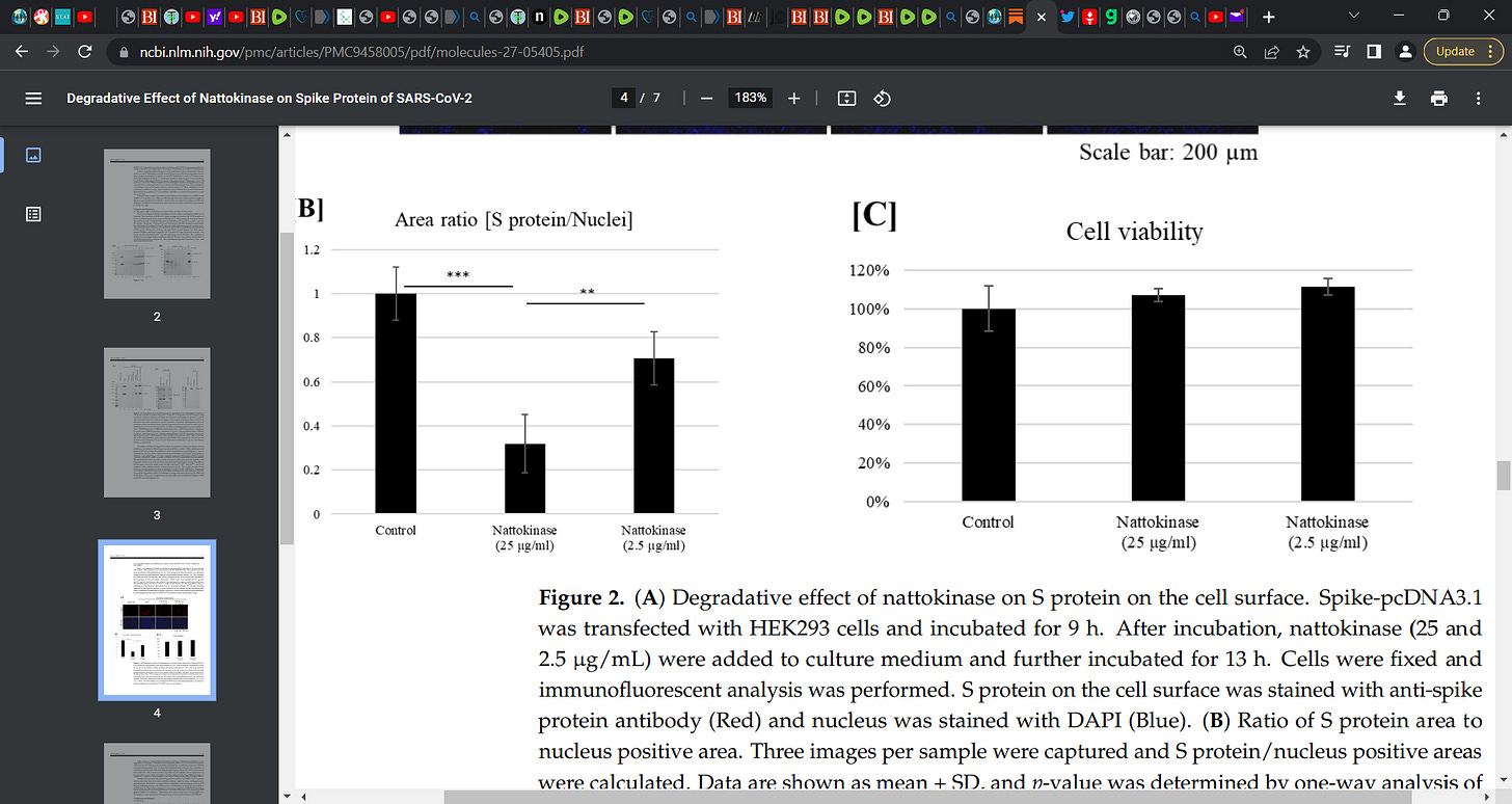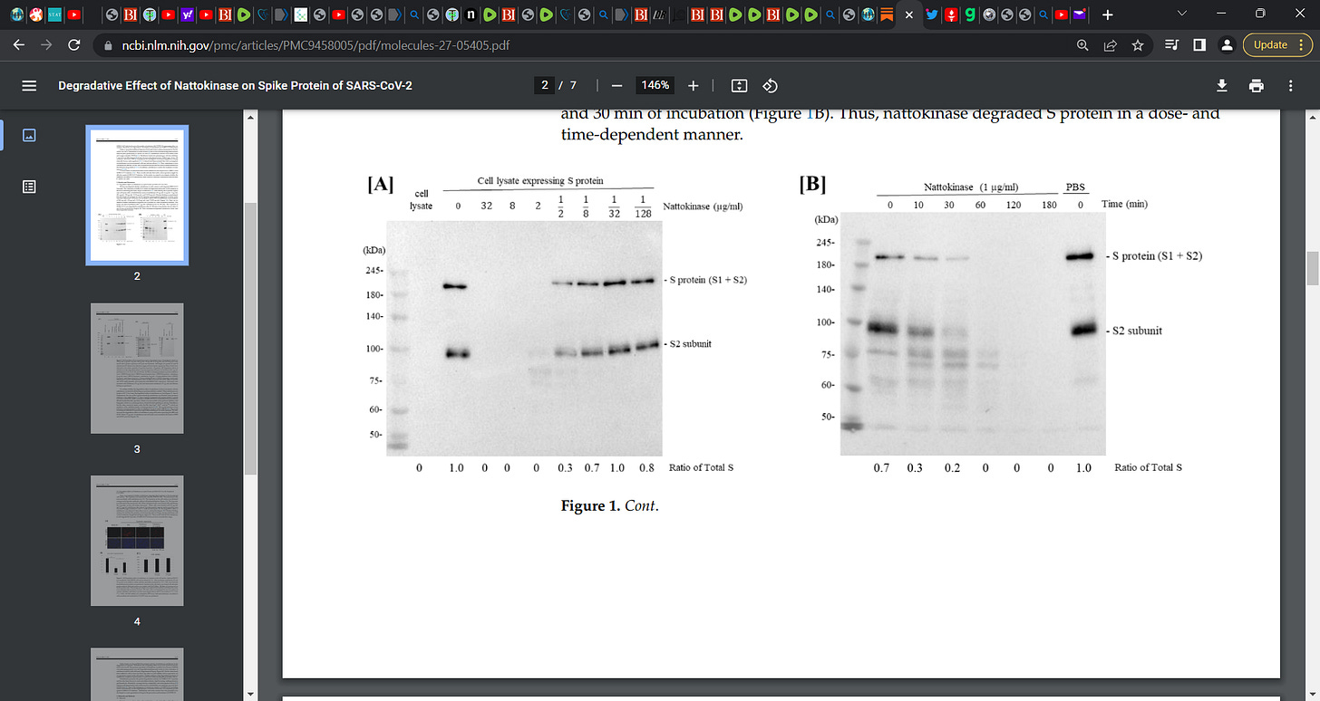 NATTOKINASE used to detoxify from the deleterious pathogenic effect of the COVID mRNA-DNA synthetic SPIKE protein (as well as spike from the virus itself); research evidence