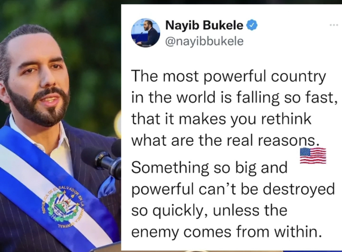 Nayib Bukele, President of El Salvador is saying what we all know to be true, that the US is being destroyed from within; the fall is too fast & too great, that the enemy is within; Cicero someone?