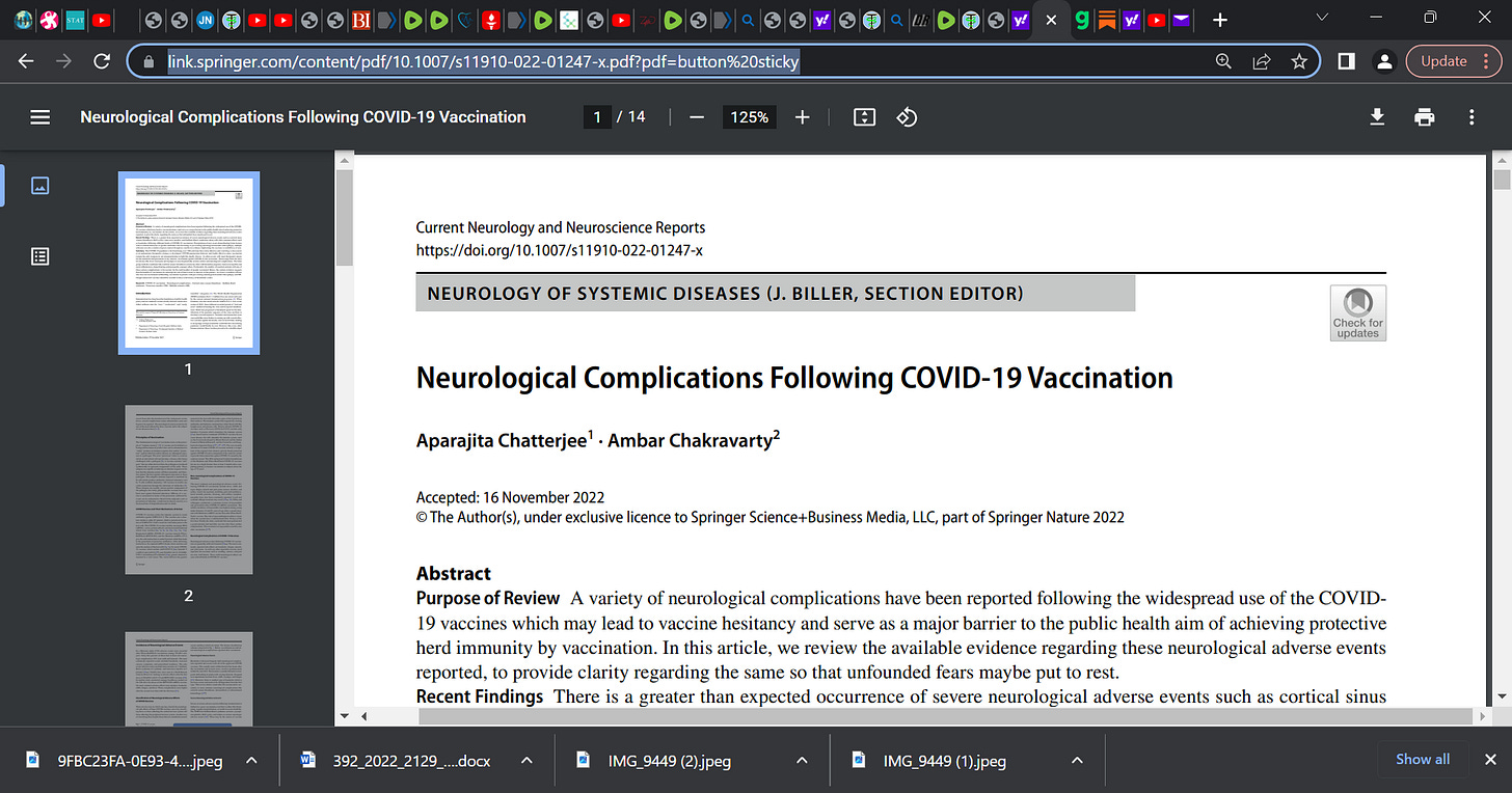 Chatterjee A, Chakravarty A. Neurological Complications Following COVID-19 Vaccination. Curr Neurol Neurosci Rep. 2022 Nov 29:1–14. doi: 10.1007/s11910-022-01247-x. Epub ahead of print. PMID: 36445631; PMCID: PMC9707152.