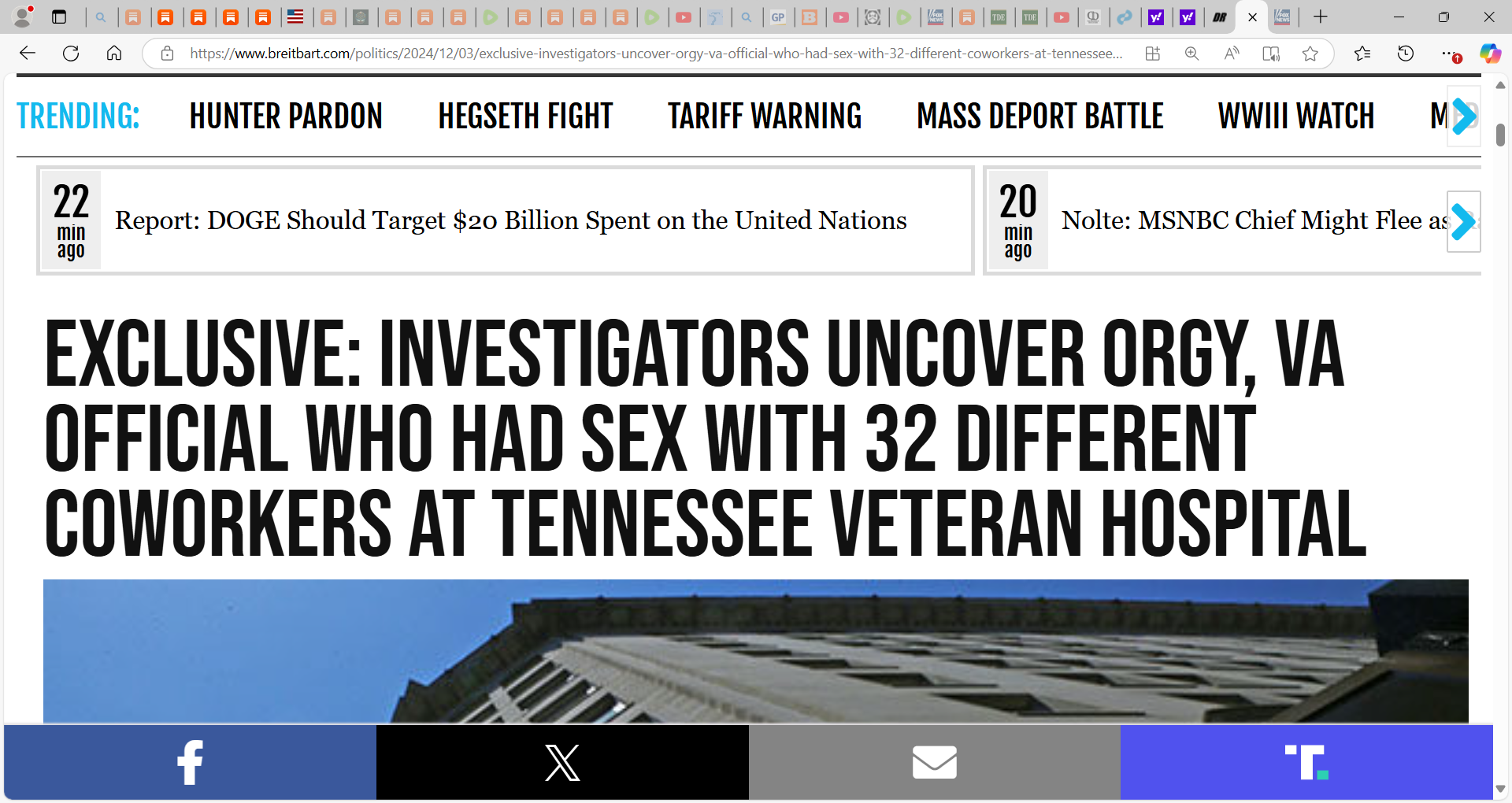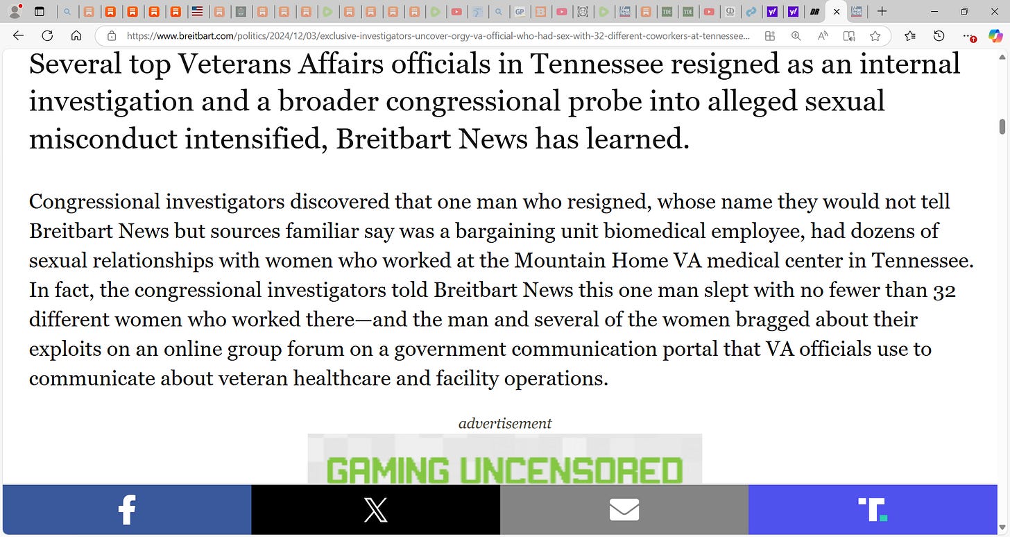 ‘What’s more, sources familiar with the congressional investigation told Breitbart News they uncovered that an orgy of at least 12 officials who work at the facility took place. It’s unclear at this time whether the orgy happened on government property at the VA facility or off-site—but the mere fact that a dozen of the government workers employed there did this is astounding.