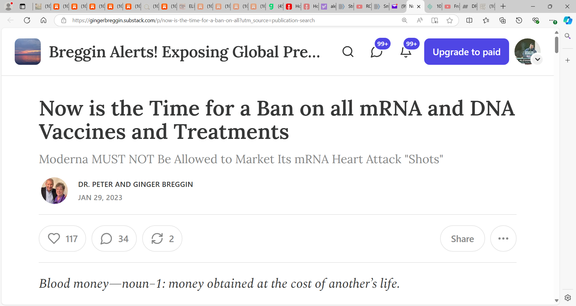'Now is the Time for a Ban on all mRNA and DNA Vaccines and Treatments; Moderna MUST NOT Be Allowed to Market Its mRNA Heart Attack "Shots"'; excellent substack by Dr. Peter Breggin & Ginger Breggin