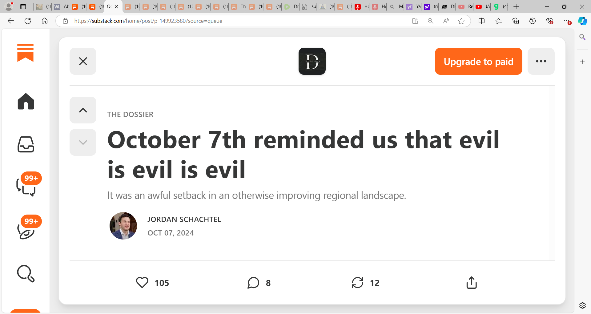 Sure, Osama bin Laden had a complicated history. That doesn’t mean he gets a free pass for ordering the attacks on 9/11. Sure, Israeli leaders were foolish to try to play 4d chess with Palestinian political entitites in Gaza. That doesn’t mean that the savages who carried out the attacks on 10/7 are any less evil.