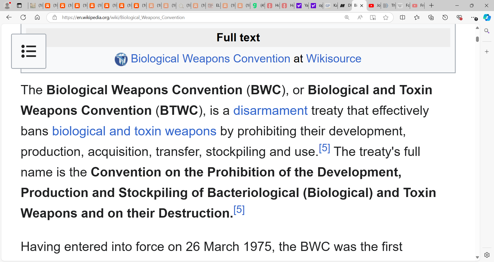 ‘Having entered into force on 26 March 1975, the BWC was the first multilateral disarmament treaty to ban the production of an entire category of weapons of mass destruction.[5] The convention is of unlimited duration.[6] As of July 2024, 187 states have become party to the treaty.[7] Four additional states have signed but not ratified the treaty, and another six states have neither signed nor acceded to the treaty.[8]
