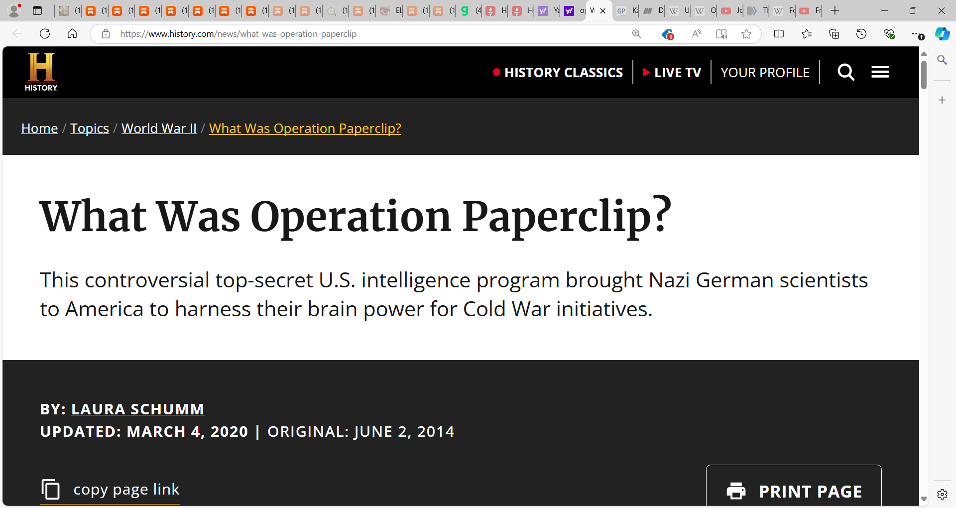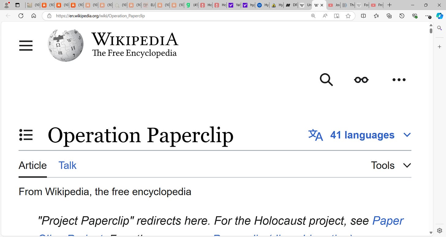 Operation Paperclip ‘was a secret United States intelligence program in which more than 1600 German scientists, engineers, and technicians were taken from former Nazi Germany to the U.S. for government employment after the end of World War II in Europe, between 1945 and 59. Most were former members and leaders of the Nazi Party.’