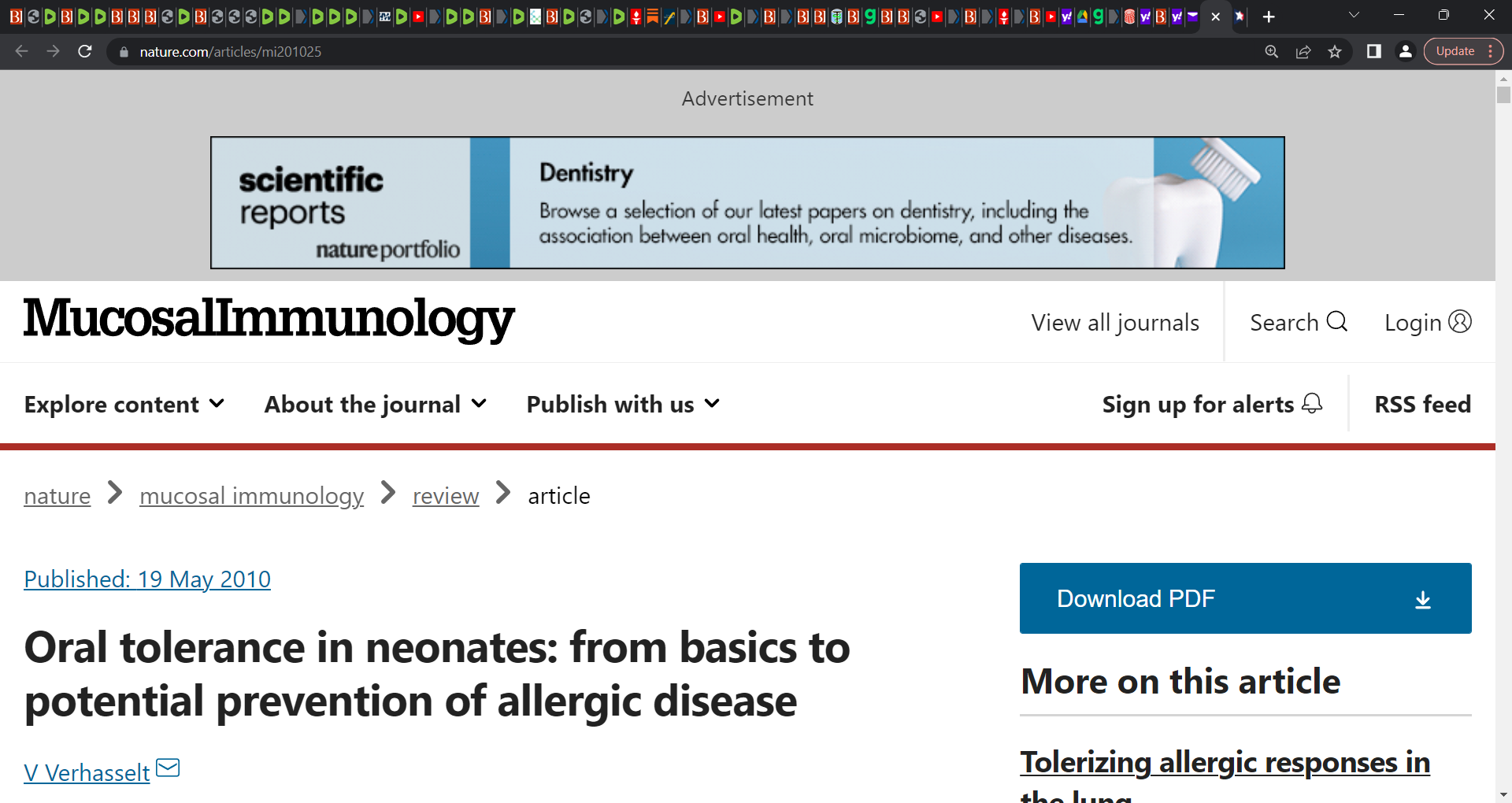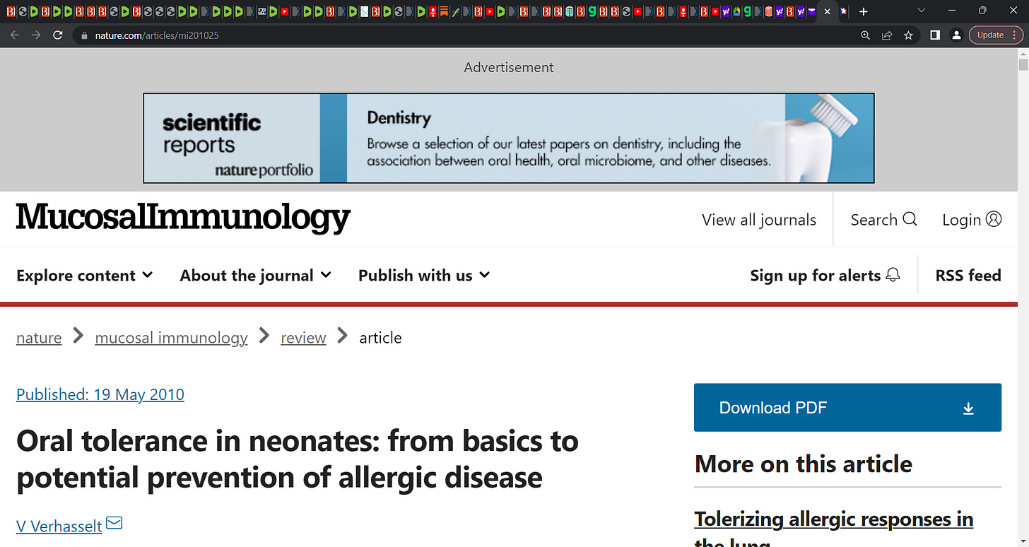 ‘Immune responses induced in early life to environmental and dietary antigens will be decisive for children and their adult response to these antigens, and they will condition development of immune-mediated diseases such as allergies and autoimmunity. Maternal influence on neonatal tolerance induction through breast-feeding is probably of great importance because of dietary and environmental antigen transfer through breast milk and the pleiotropic effects of breast-feeding on gut and immune system maturation. In addition, maternal history and maternal sensitization to common environmental and food antigens will probably affect antigen transfer to the breastfed child along with tolerance induction.’