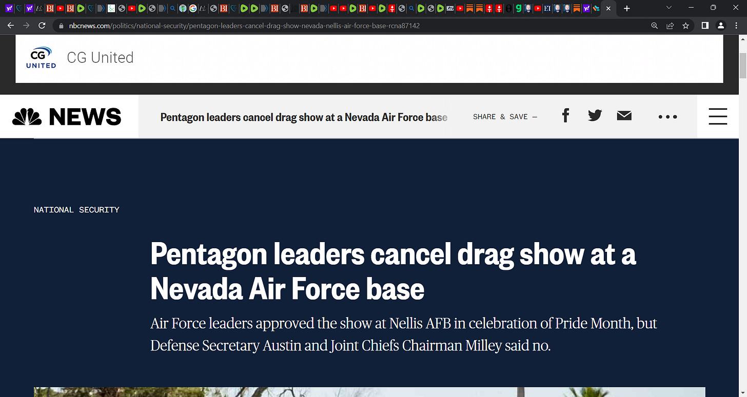 'Pentagon leaders cancel drag show at a Nevada Air Force base'; what can I say, thanks? who in good heavens name would even contemplate this in the first place? this is the US military today?