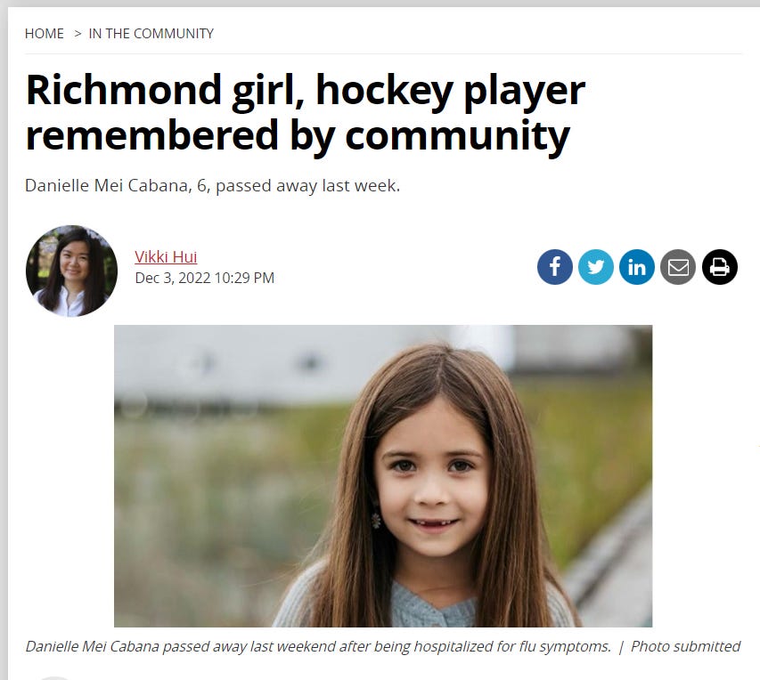 Danielle lived in Richmond, British Columbia. She was a hockey player, a member of the Richmond Ravens U7 girls hockey team. She died suddenly on Nov.26, 2022 (click here).