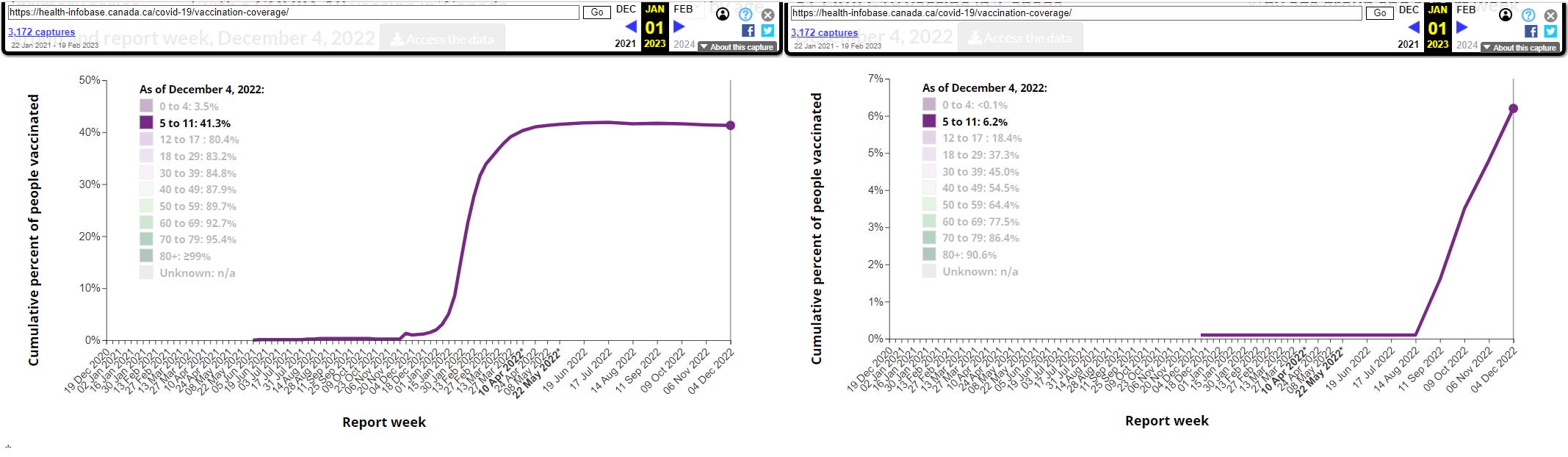 The graphs below show 2-dose mRNA uptake on the left and booster mRNA uptake on the right, as percentage of all Canadian children ages 5-11, and 12-17.