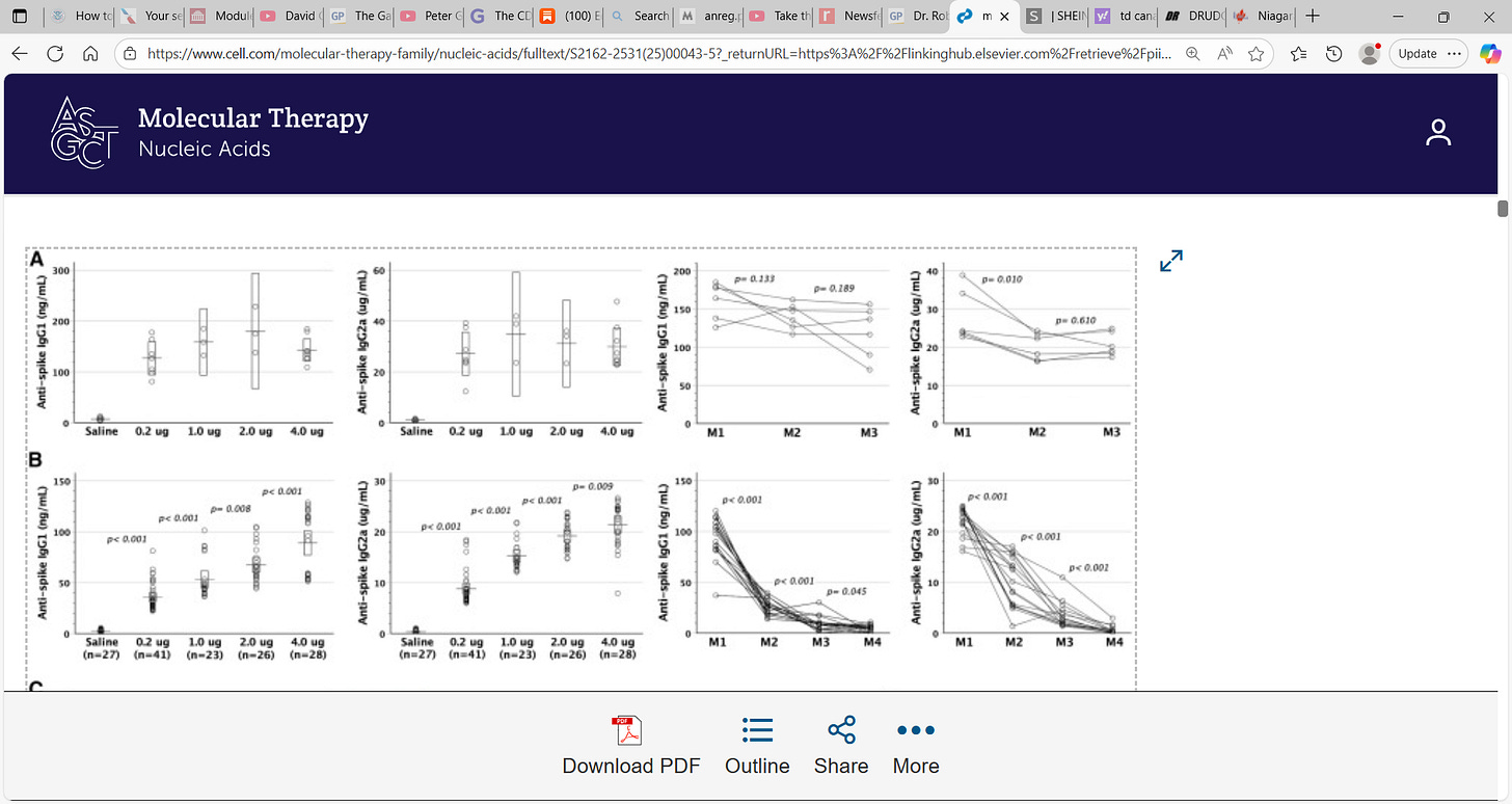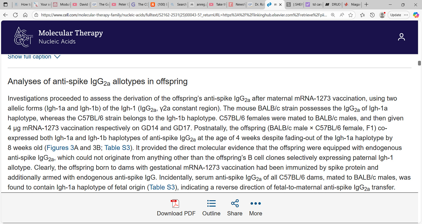 Researchers found: ‘Transplacental mRNA-1273 proved immunogenic in the fetuses, as postnatally equipped with anti-spike immunoglobulin (Ig)M, paternal allotypic anti-spike IgG2a, and heightened anti-spike cellular immunity. Gestationally administered, mRNA-1273 had a dose-dependent effect on its transplacental transfer and immunogenicity in the fetuses, with higher mRNA-1273 doses leading to increased transplacental mRNA-1273 passage and greater serum titers of endogenous anti-spike IgM/IgG generated by the fetuses.’