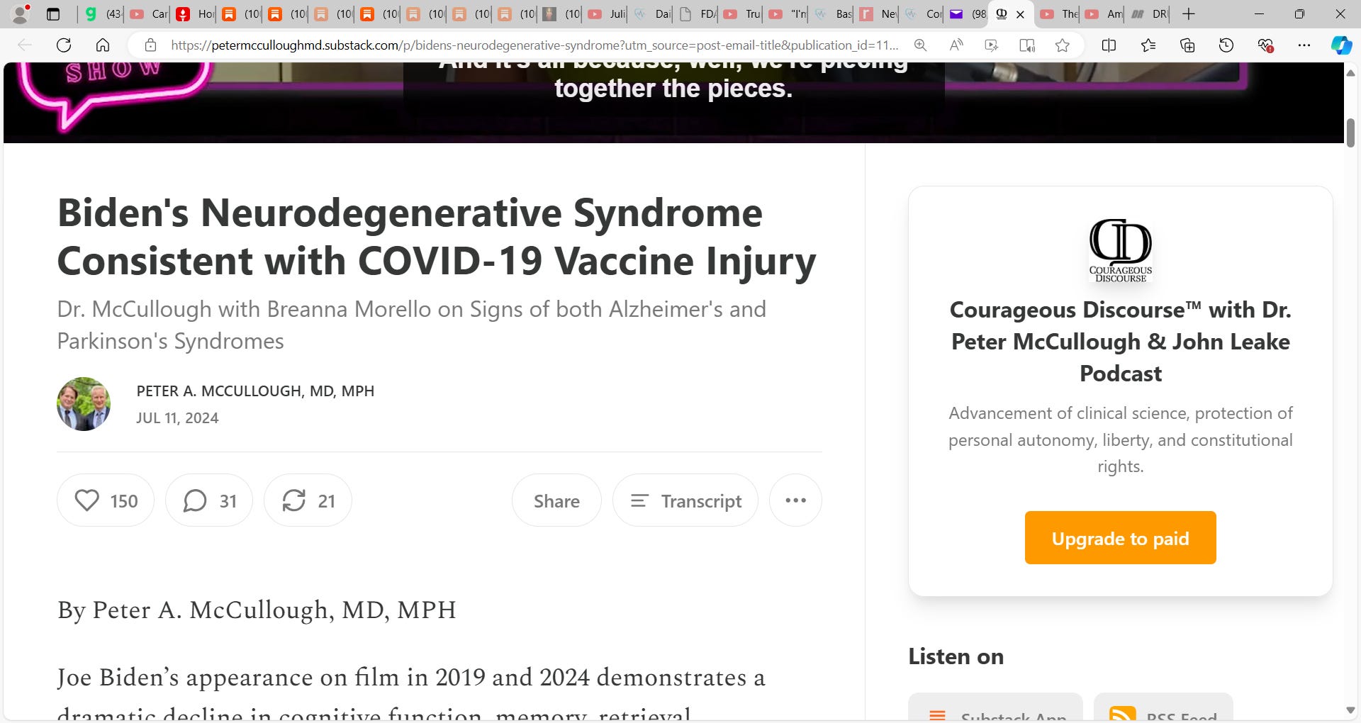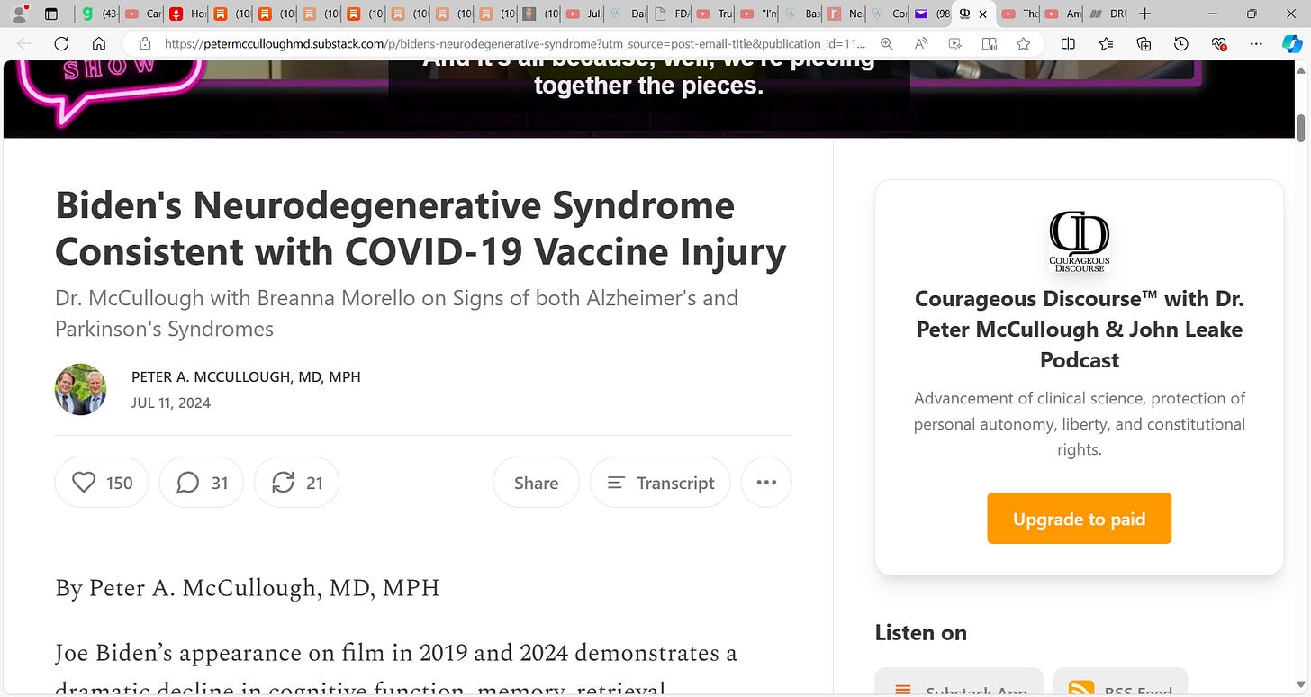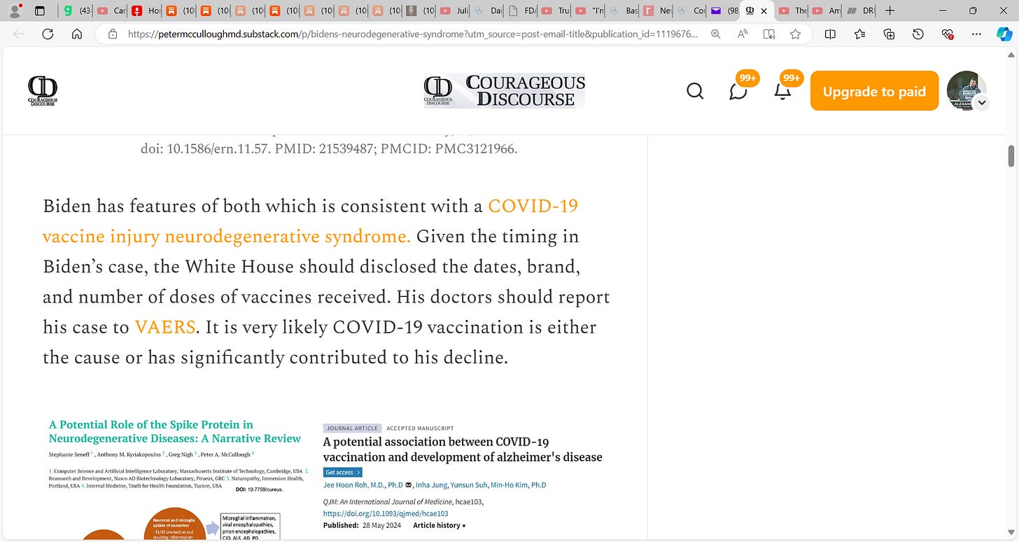 McCullough is saying the unsafe and deadly Malone Bourla Bancel Sahin Weissman et al. COVID mRNA technology injection may have well contributed (at least in part) to his (Biden’s) neurological decline. This is maybe true and I would place it on the table as we set the table, and close to the center. Experts are saying and these are Parkinsons experts etc. that it is clear Biden has some level of Parkinsons or Alzheimer’s. In my opinion, I think due to the consequence of aging, that he has elements of both of these. So, I think that the mRNA vaccine is likely to have accelerated his neurological decline such that he may have started on the Parkinsons or Alzheimer’s train (which is ok and part of life and look, we all have elements of dementia as we age and it begins even at 50, we all have some loss as brain function, cells decline, it is LIFE, you cannot stop it so stop clutching your pearls and getting the vapors, we just work around it as we re-engineer our life and environment) yet the vaccine exploded its pace or emergence.