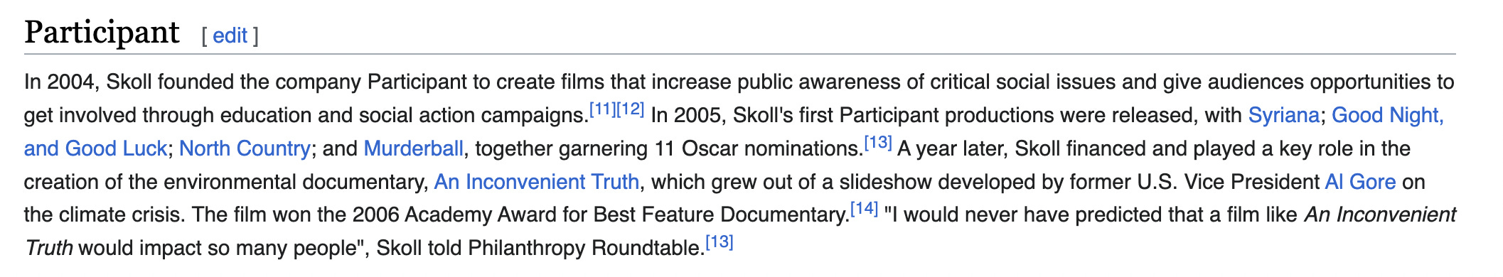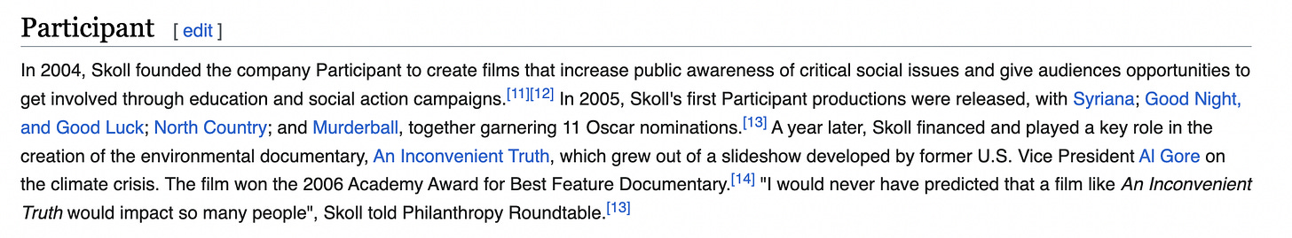 A year later, Skoll financed and played a key role in the creation of the environmental documentary, An Inconvenient Truth, which grew out of a slideshow developed by former U.S. Vice President Al Gore on the climate crisis. The film won the 2006 Academy Award for Best Feature Documentary. "I would never have predicted that a film like An Inconvenient Truth would impact so many people", Skoll told Philanthropy *Roundtable.[13]