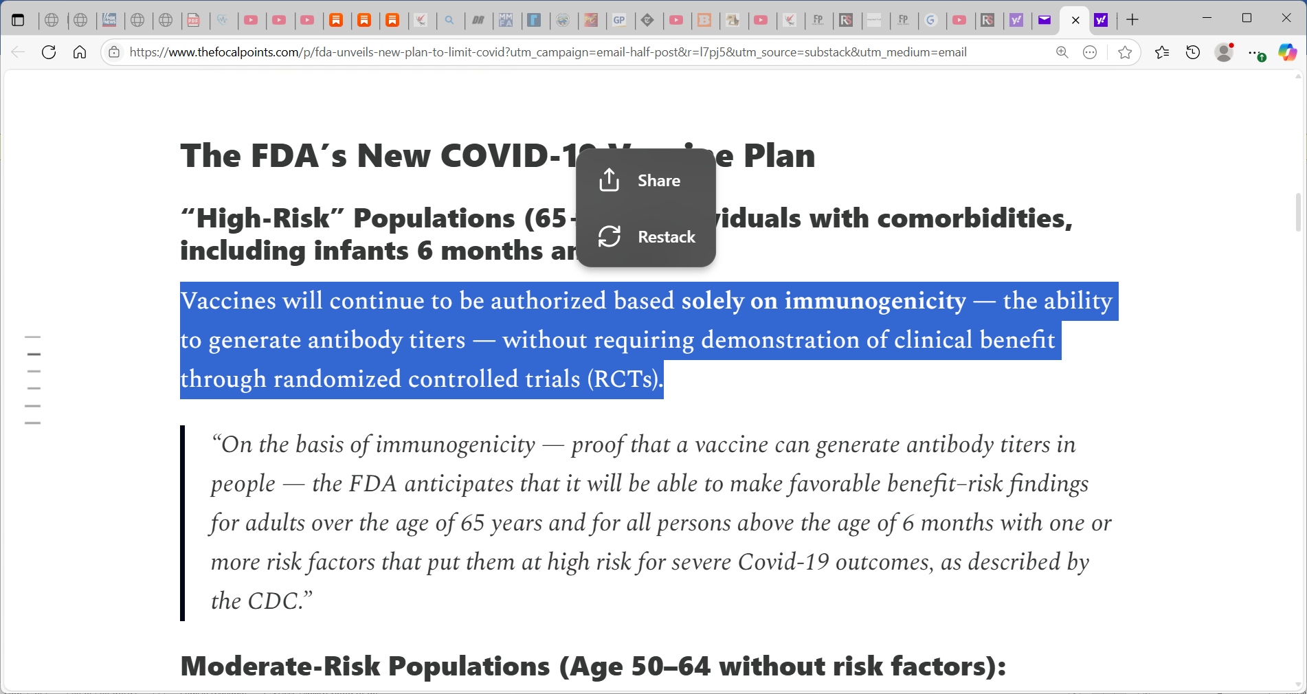 “On the basis of immunogenicity — proof that a vaccine can generate antibody titers in people — the FDA anticipates that it will be able to make favorable benefit–risk findings for adults over the age of 65 years and for all persons above the age of 6 months with one or more risk factors that put them at high risk for severe Covid-19 outcomes”…yet these clowns know that immunogenicity like antibody titers gives no credible reading of immunity and does not tell us if immunity is conferred and what we always needed was hard objective patient important outcomes such as deaths, ICU, hospitalization, severe adverse effects etc. We never got that from Pfizer or Moderna, yet these clowns will continue this and allow vaccine, and I suppose drug makers to continue this practice and maybe they are also going to continue the bullshit ‘immuno-bridging’ as a measure of immunity.