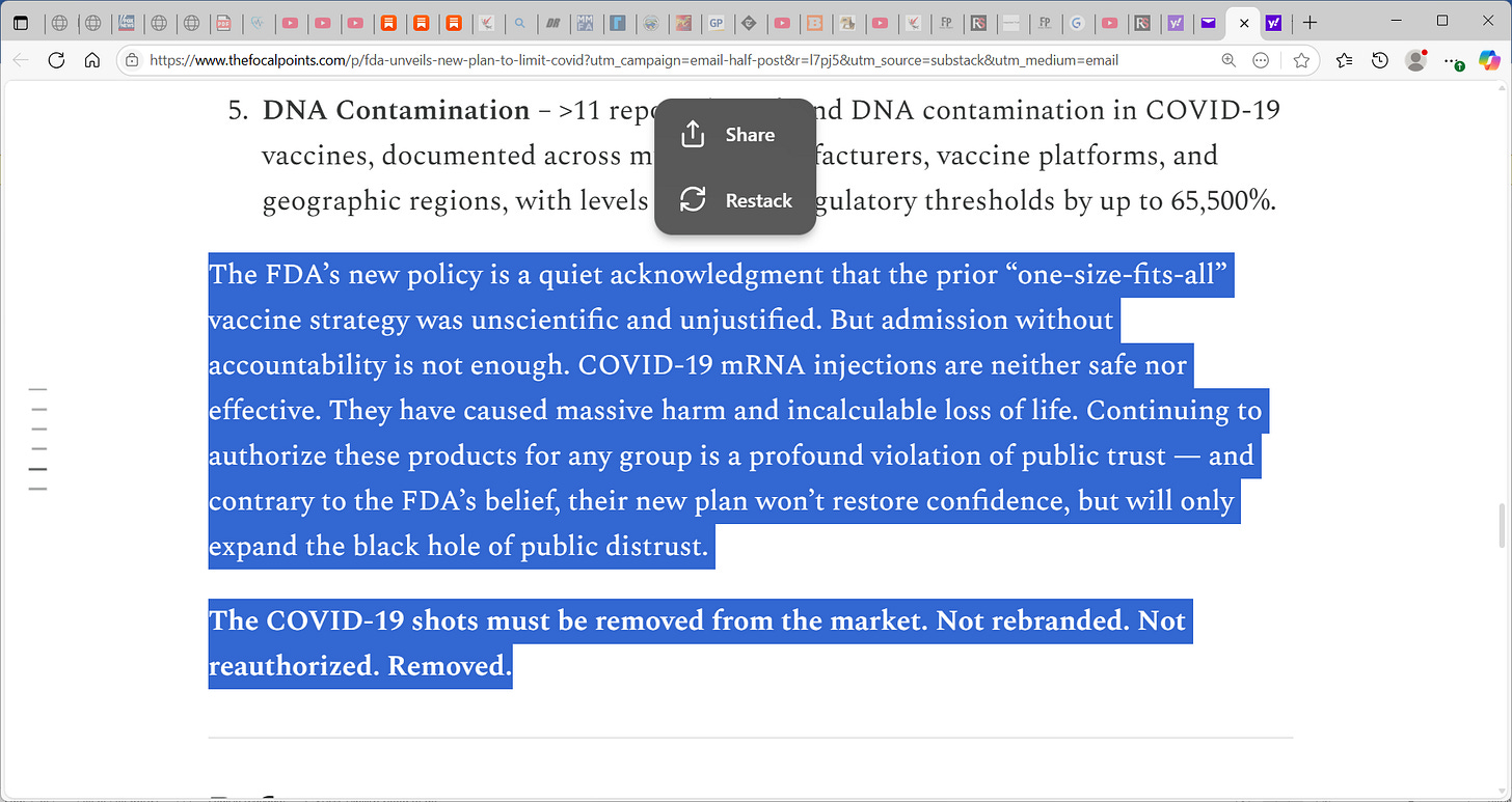 100% “The FDA’s new policy is a quiet acknowledgment that the prior “one-size-fits-all” vaccine strategy was unscientific and unjustified. But admission without accountability is not enough. COVID-19 mRNA injections are neither safe nor effective. They have caused massive harm and incalculable loss of life. Continuing to authorize these products for any group is a profound violation of public trust — and contrary to the FDA’s belief, their new plan won’t restore confidence, but will only expand the black hole of public distrust.