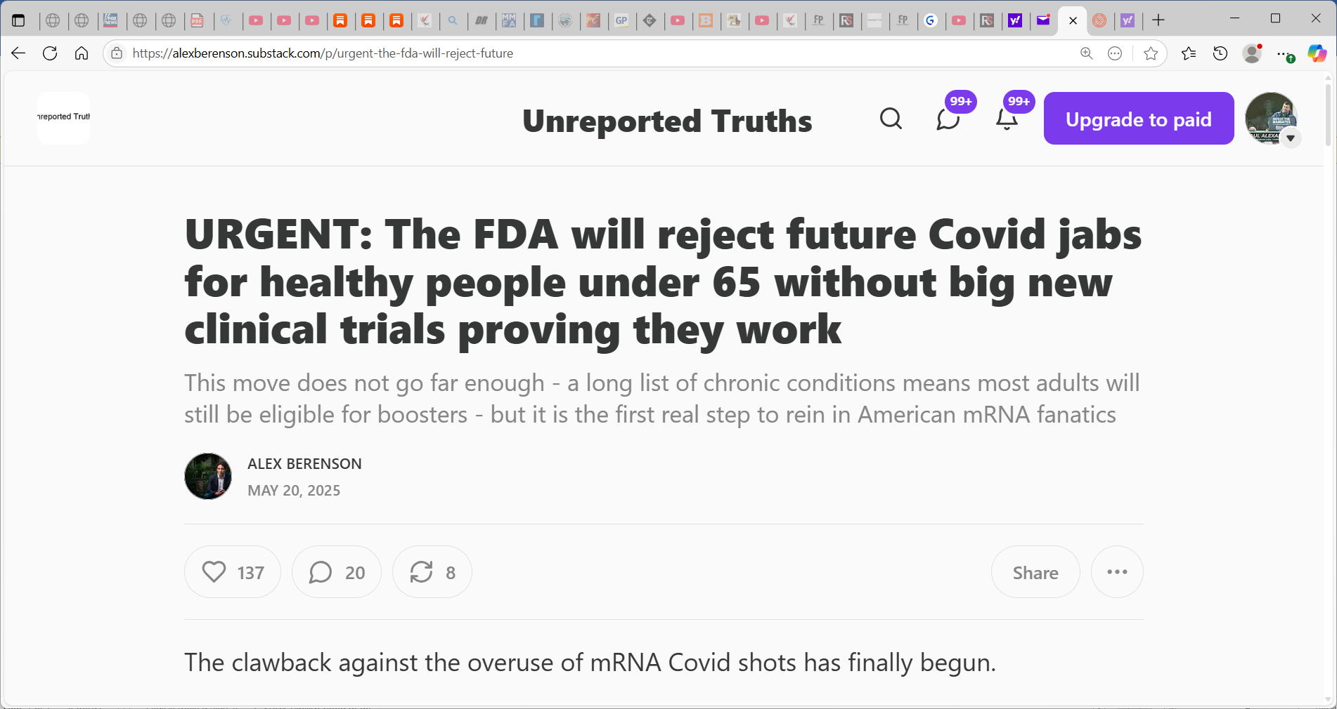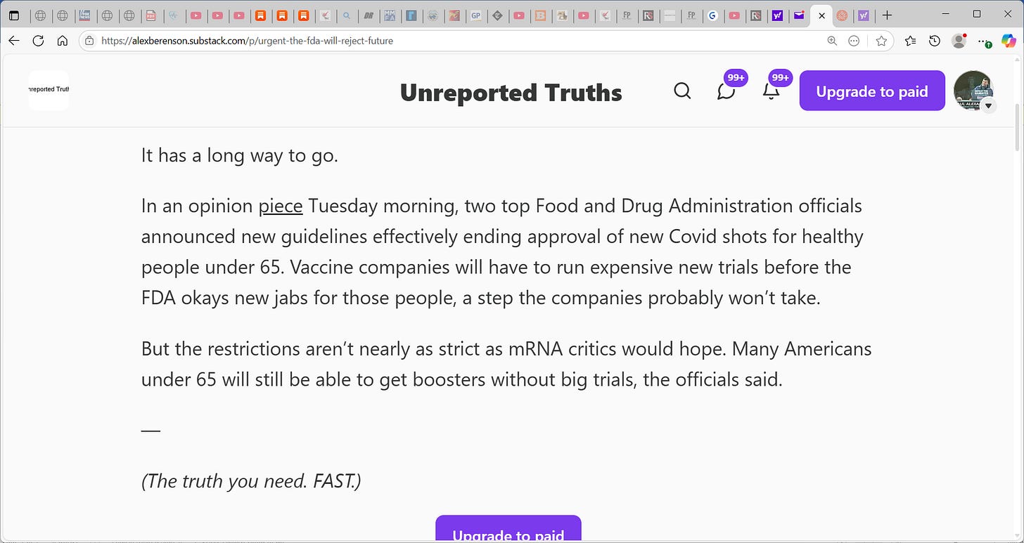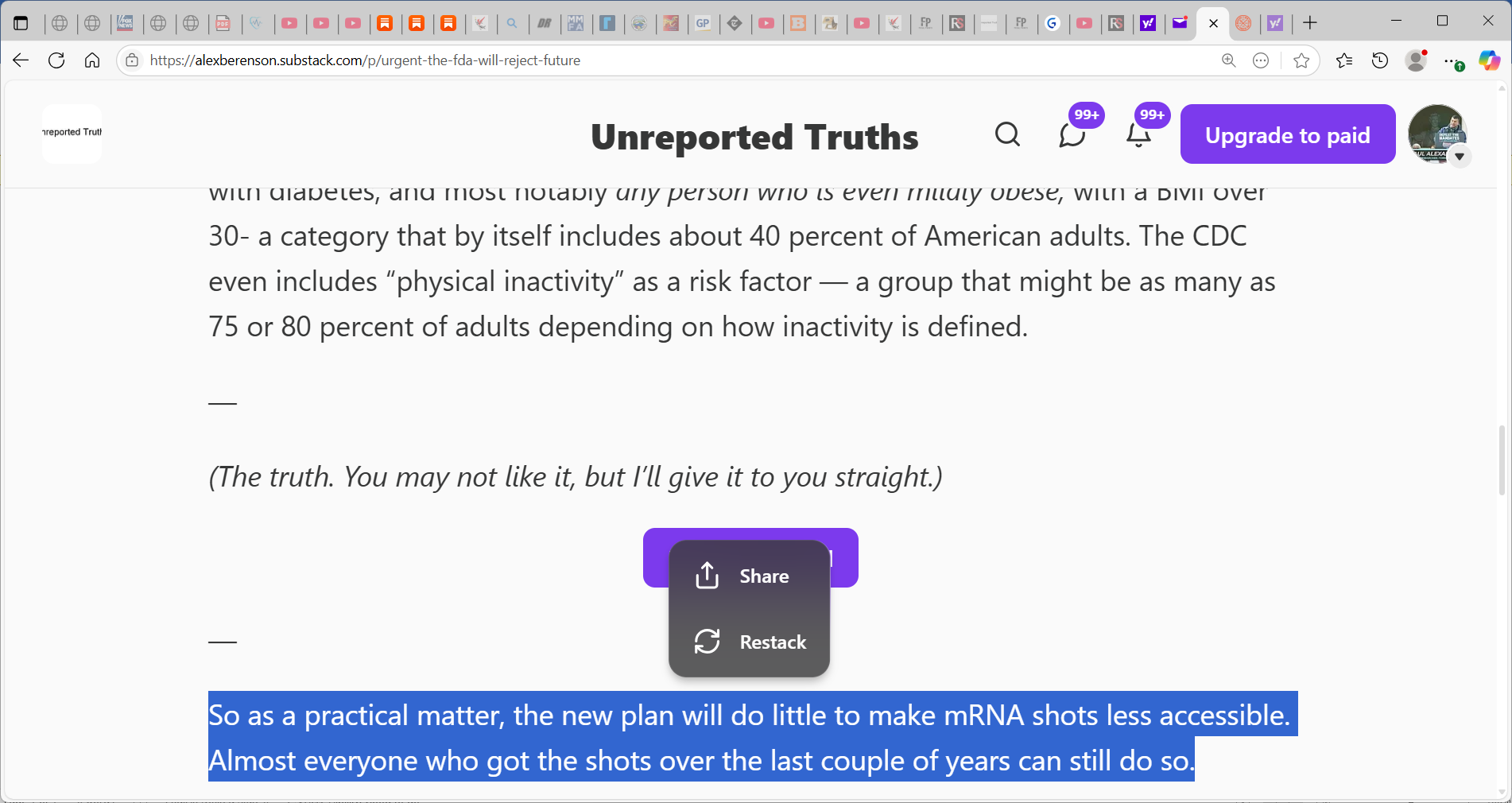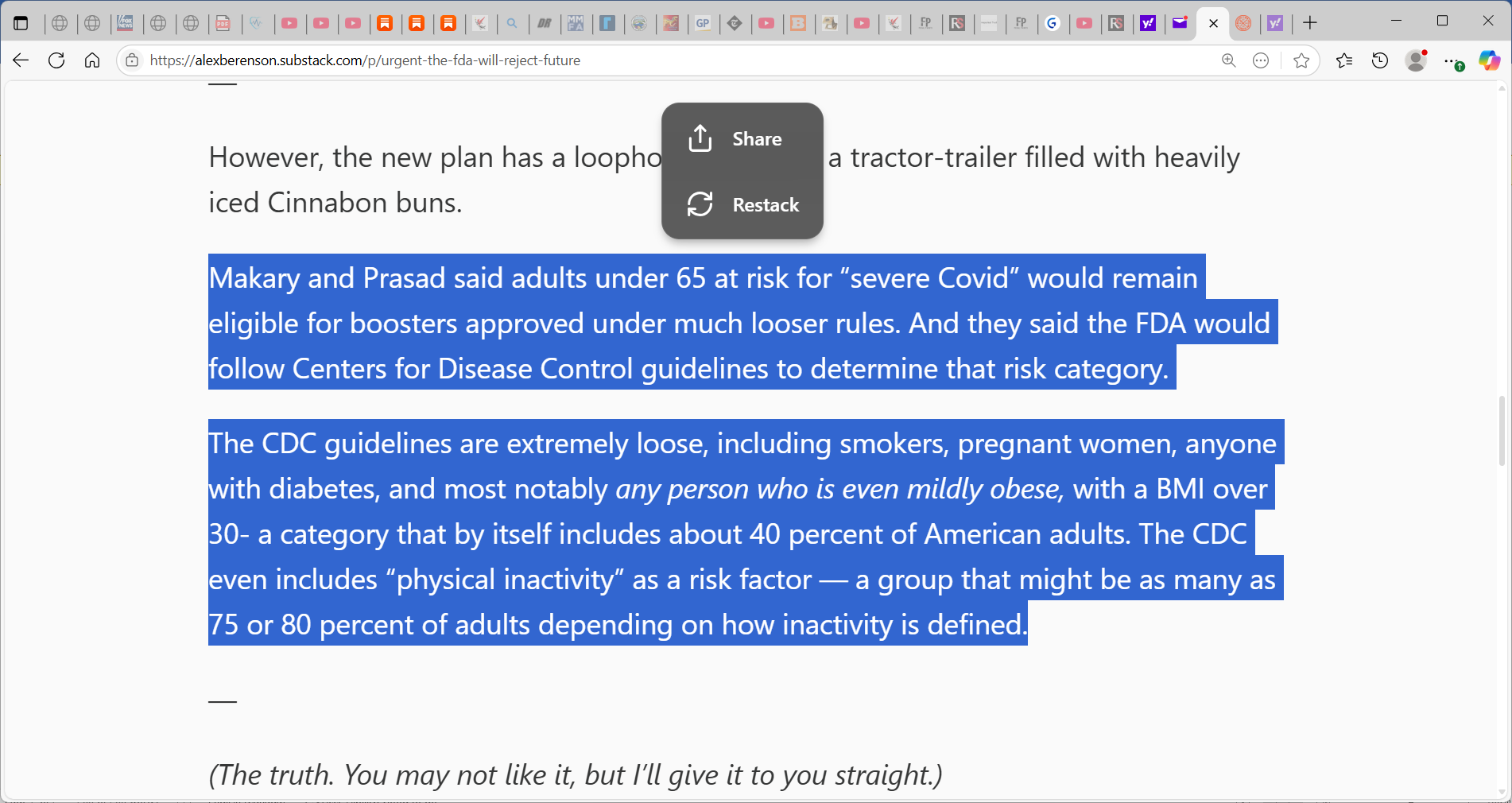Shame on you Marty and Vinay for selling out, shame on you two! I defended you two prior. What a moron I was. Same horse, different saddle. That is all we have now. What you have basically written is NOTHING for Americans less than 65 will STILL be able to get boosters so even in that you are lying to the reader. gggeeezzzeee, at least if bullshitting, then bullshit us with some real bullshit. At least Alex has some stones to tell the truth as you lied and bullshitted us in your NEJM piece or tried to…