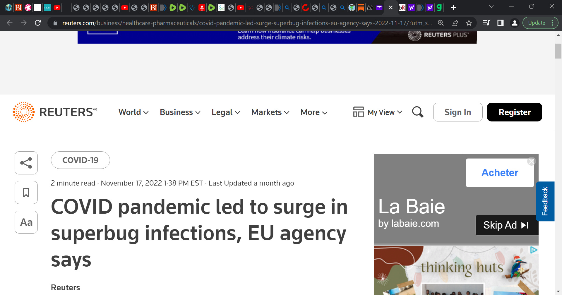 ‘Infections from some antibiotic-resistant pathogens known as superbugs have more than doubled in health care facilities in Europe, an EU agency said on Thursday, providing further evidence of the wider impact of the COVID-19 pandemic.