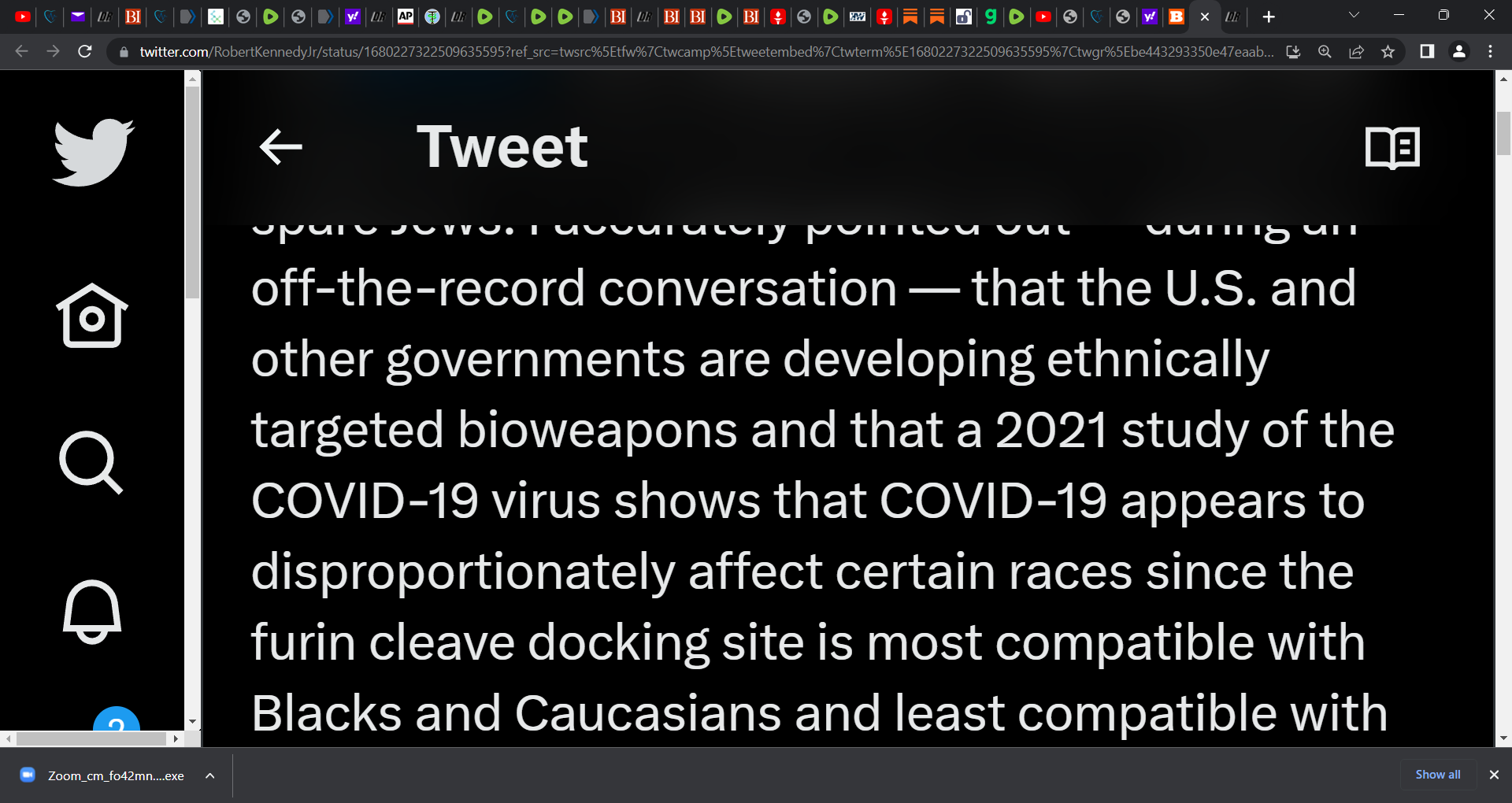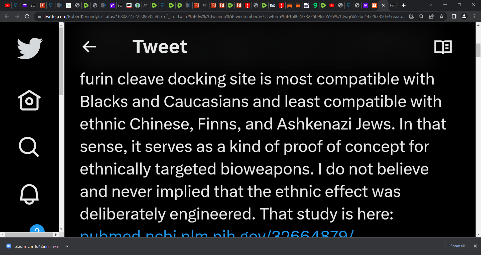 Neocon RINOs and Dems created SARS-CoV-2 at University of North Carolina at Chapel Hill during the Obummer/Bribedem administration for the purpose of exterminating races they deem inferior. There is no way they would have designed it to exempt the Chinese or Jewish people. RFK Jr knows this. He is in no way antisemitic. The University of North Carolina team modified a spike and included HIV sequences and added it to a coronavirus backbone. They designed it to have a mild prodrome (COVID-19 IS the prodrome) with a low IFR that would manifest within days to weeks and kill only several million initially. They designed it to target the haplogroups of Eastern Slavs and others deemed by the neocon RINOs and Dems to be inferior races. They designed it to be oncogenic and to hide in the body from the immune system and to produce slow HIV-like effects during an incubation period of years following the prodrome before it would produce full SARS-CoV-2 disease. They transported it to biolabs in Ukraine near the border with Russia and to Wuhan in China. They released it in China to blame on China. They needed to scapegoat China. China has almost no history of attacking other nations in contrast to the US which regularly attacks small, underdeveloped nations and has used Weapons of Mass Destruction on civilian populations such as when the US launched nuclear attacks on the civilian cities of Hiroshima and Nagasaki in Japan. They wanted to make China look bad to make neocon RINOs and neolib Dem warmongers look better. The US typically leaves a legacy of targetting foreign races with long term effects on children and other civilians from agents or munitions such as unexploded cluster munitions, depleted uranium, napalm or Agent Orange. In Iraq the US, when ruled by neocon RINOs, butchered up to nearly a milllion civilians according to an epidemiological study published many years ago in The Lancet, back when the Lancet was still a reputable journal. The US typically attacks only small, sparsely populated underdeveloped adversaries who lack capacity to retaliate and usually does so safely from 50,000 feet up in the sky or from cruise missiles fired from several hundred miles away while praising itself for its bravery. It does not attack large developed nations that can fight back except in proxy wars. This hasbecome embarassing for the US. Further, the US is typically defeated by the tiny, underdeveloped nations it attacks. Other than when it removed the secular regime in Iraq and set the stage for the rise of ISIS and islamofascism in Iraq, the US has not won any of the wars it has started since WWII when it used nukes on civilians. On the present occasion it has used WMDs on its own people because it needed a pretext for widespread mail in voting before the 2020 election. The neocon RINOs and Dems needed hundreds of thousands of Americans dead before the election and Trump's economy destroyed to blame on Trump. They wanted Biden installed at any cost. Now they want DeSantis installed. The millions of other races dead in other countries because of the real, as to fake, prodrome of the virus and because of the vax and the millions more of deaths to come from full blown SARS-CoV-2 disease and the vax are just the icing on the cake.