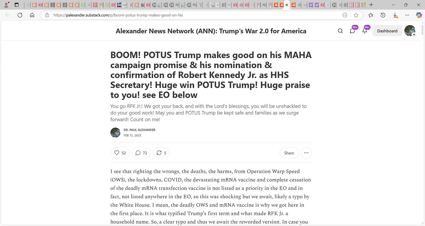 he endorsed Trump some months ago was always WRONG, his silence since the election was wrong and I know, I know inside, he was silenced. He will in time need to explain that for it has affected his gravitas and stature…Americans are not stupid! I have told him that if he ran in 2028, I would support him, I do think he is better in terms of what can be done for USA across the board, on balance, save the nuttiness on global warming and guns (and it won’t happen) and I will. I do think a principled man and, in his heart, seeks to do good. I trust him and support him at HHS. I do think major forces now quasi-OWN him and this is the problem. His interview on FOX with Ingraham yesterday post swearing in, told us that for his responses did not match his prior positions on OWS or the mRNA shots nor the vast evidentiary landscape on the deadliness of the mRNA vaccines.