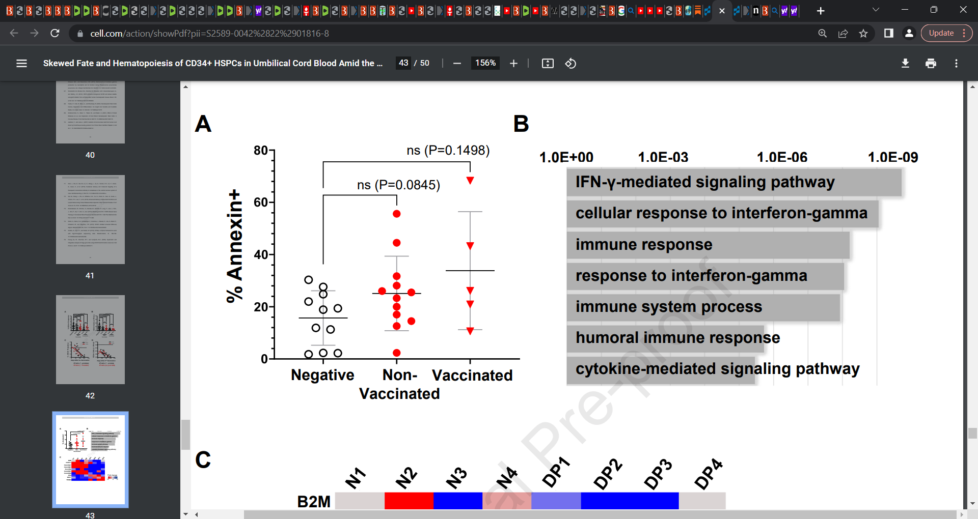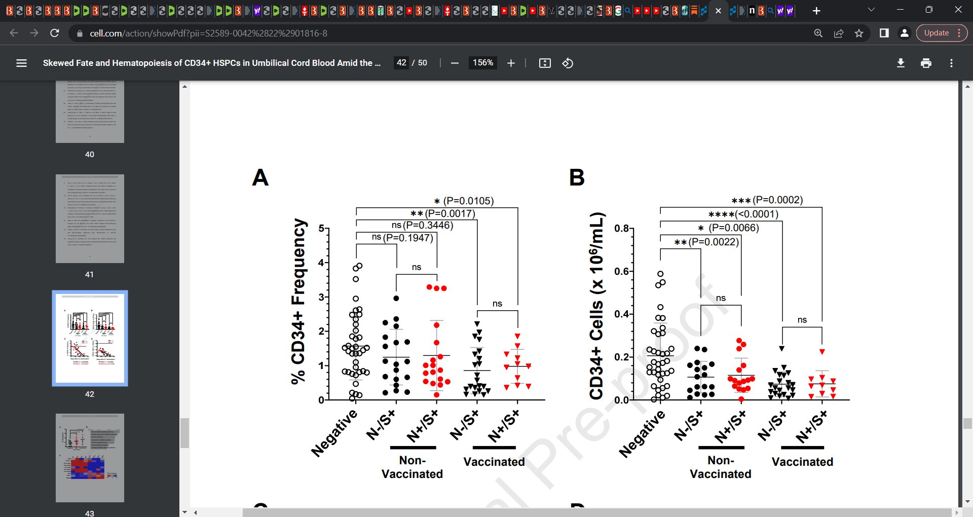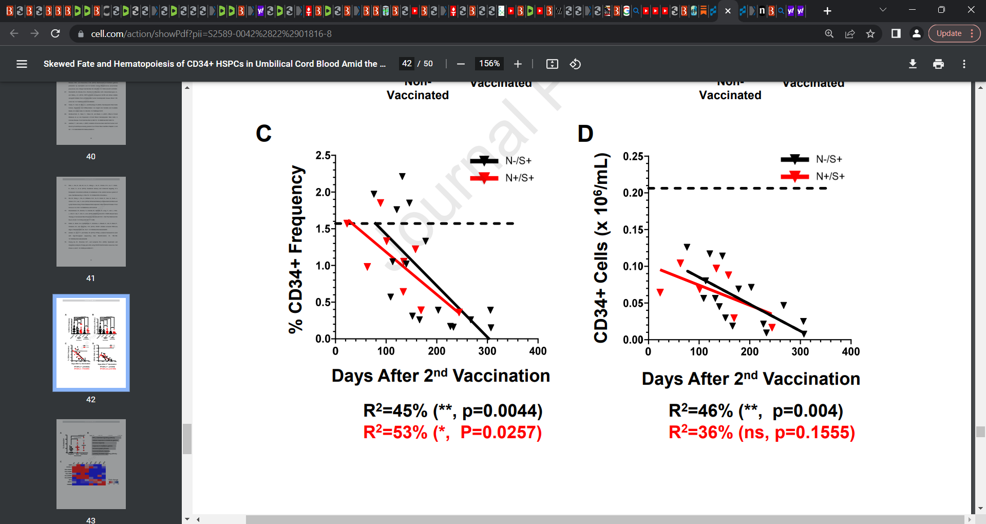“Reduced CD34+ cell frequencies and thus lower CD34+ cell numbers were observed in the UCB from the nonvaccinated but previously infected donor group and even more so in the vaccinated donor group, which was attributed to the induction of apoptosis. Furthermore, these reductions in CD34+ cell numbers & frequencies correlated with the timing of the 2nd -vaccination in donors ― the numbers & frequencies inversely correlated with the period after the vaccination until delivery, indicating that factors causing these damages are maintained over the gestation period. In addition, the CD34+ cells, which would be residual cells following apoptosis, showed skewed hematopoiesis profiles, indicating that previous SARS-CoV-2 infection, and likely vaccination based on the observed trends, interferes not only with the fate of CD34+ cells but also the hematopoietic abilities, phenotype, and survivability of populations thereof, which could result in a shortage of available CD34+ HSPCs from cord blood banking, processing for use towards HSPC-based therapies, as well as unpredictable hematological issues in HSPC recipients.”