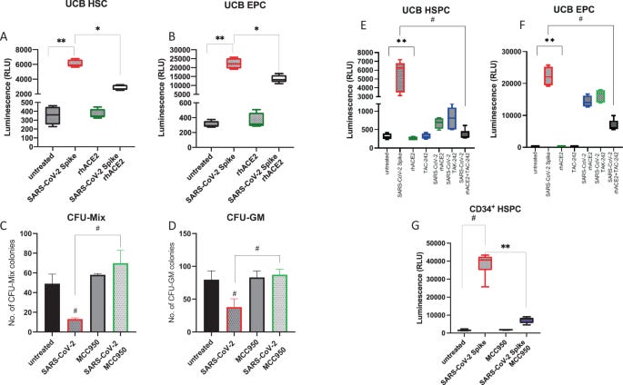 Effect of COVID-19-derived SP (20 nM, S1 + S2 ECD, His tag) and rhACE2 (20 nM) after 16 h exposure of UCB-sorted HSCs (A) and EPCs (B) on activation of caspase-1 evaluated by Caspase-Glo® 1 Inflammasome assay (Promega). Experiments were repeated three times *p < 0.01 and **p < 0.001. C, D Nlrp3 inflammasome inhibitor MCC950 recovered clonogenic potential of UCB HSPCs from the inhibitory effect of COVID-19-derived SP. Cells were exposed to SP ± MCC950 (10 µM). The data show the number of CFU-Mix (C) and CFU-GM (D) clonogenic progenitors obtained from UCB HSPCs. HSPCs were cultured in methylcellulose medium supplemented with appropriate cytokines, and CFU-Mix and CFU-GM colonies were counted using inverted microscope after 14 and 11 days of culturing. The data are presented as means ± SEM. Experiments were repeated three times #p < 0.01. Effect of COVID-19-derived SP (S1 + S2 ECD, His tag) after 16 h exposure of UCB-sorted HSCs (E) and EPCs (F) on activation of caspase-1 evaluated by Caspase-Glo® 1 Inflammasome assay (Promega). rhACE2 (20 nM) and TLR4 blocking agent (TAK-242, 5 μM) we employed alone or together. Experiments were repeated three times **p < 0.01 and #p < 0.0001. G SP-mediated activation of Nlrp3 inflammasome in CD34+ HSPC was inhibited in a presence of MCC950 (10 μM).
