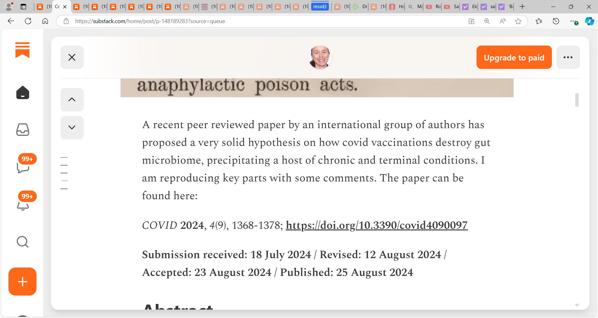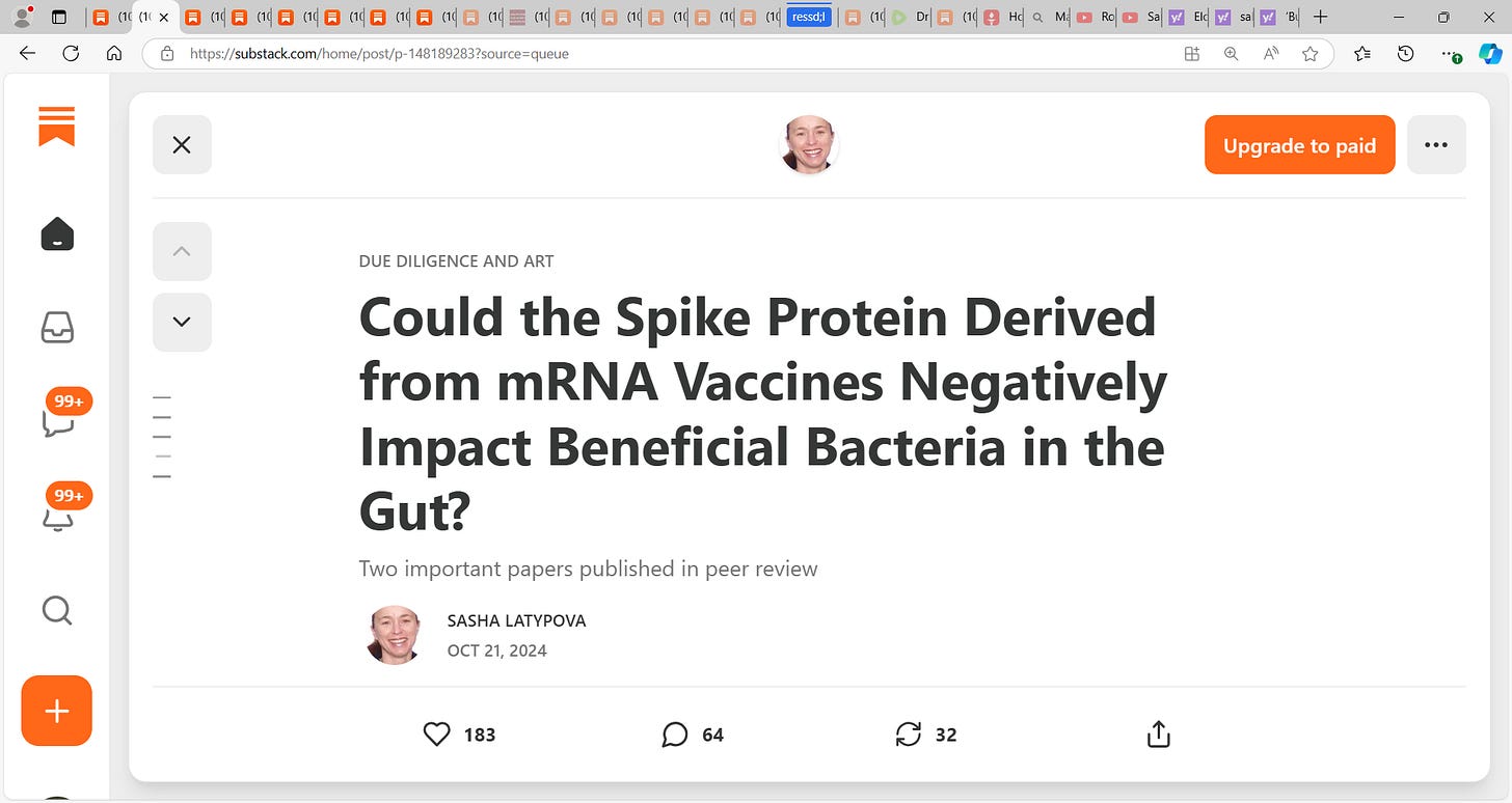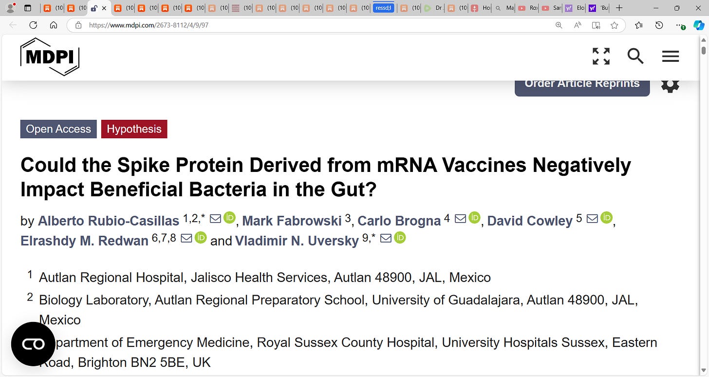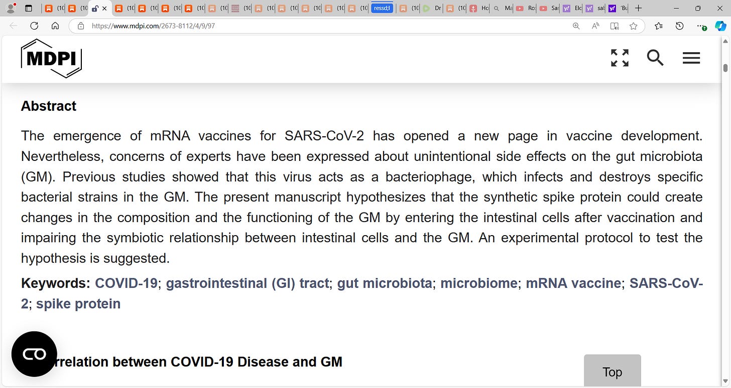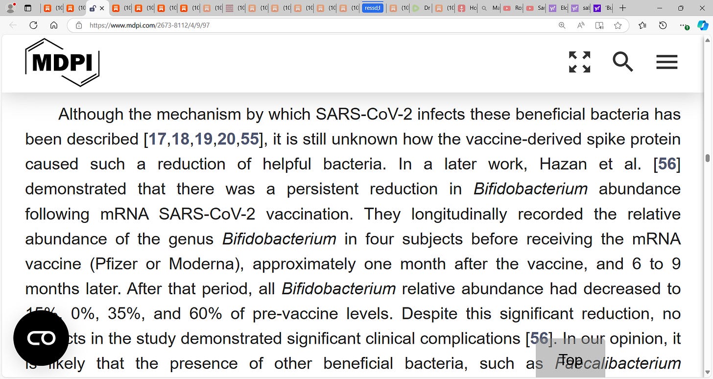 Alberto Rubio-Casillas et al. looked at how the synthetic spike protein (from the Malone et al. mRNA gene-based vaccine) could create changes in the composition and the functioning of the GM (gut microbiota) by entering the intestinal cells after vaccination and impairing the symbiotic relationship between intestinal cells and the GM….I credit Hazan et al. for their pioneering work and the reality is that we struggle (and so I give all credit) with whether this is real or not, COVID virus was real as to the implicating factor for we hypothesize too that it may have been a toxin or poison that provoked the severe pulmonary ILI symptoms in many of our vulnerable high-risk person leading to breathing issues…remember too that COVID or whatever this was actually had less to do with a pulmonary respiratory issue and more a blood clotting coagulation issue needing high doses of blood thinning e.g. high-dose aspiring, heparin etc. to clear micro-thrombi across the vasculature. This is very interesting research and adds another dimension.