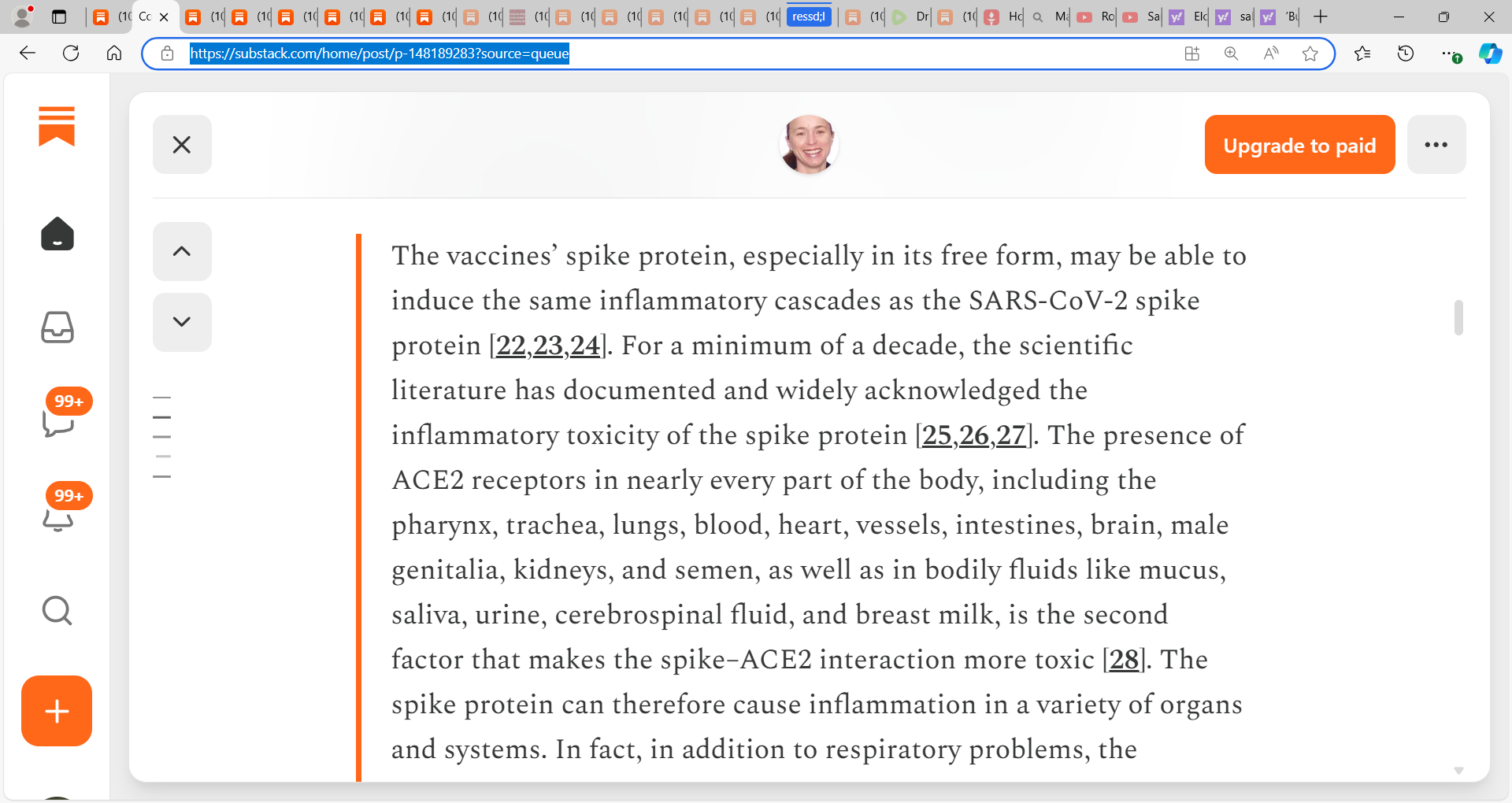 ‘The vaccines’ spike protein, especially in its free form, may be able to induce the same inflammatory cascades as the SARS-CoV-2 spike protein [22,23,24]. For a minimum of a decade, the scientific literature has documented and widely acknowledged the inflammatory toxicity of the spike protein [25,26,27]. The presence of ACE2 receptors in nearly every part of the body, including the pharynx, trachea, lungs, blood, heart, vessels, intestines, brain, male genitalia, kidneys, and semen, as well as in bodily fluids like mucus, saliva, urine, cerebrospinal fluid, and breast milk, is the second factor that makes the spike–ACE2 interaction more toxic [28]. The spike protein can therefore cause inflammation in a variety of organs and systems. In fact, in addition to respiratory problems, the majority of COVID-19 patients also experience neurological, cardiovascular, intestinal, and renal dysfunctions [29,30,31,32,33]. Since the spike protein is found in SARS-CoV-2 and also produced in response to mRNA vaccines, such toxicity consequently could be induced by both severe forms and long COVID-19, as well as all vaccines that are based on the unregulated synthesis of the spike protein by various cells, as opposed to vaccines that are made from inactivated whole virus or based on inactivated spike protein [22].’